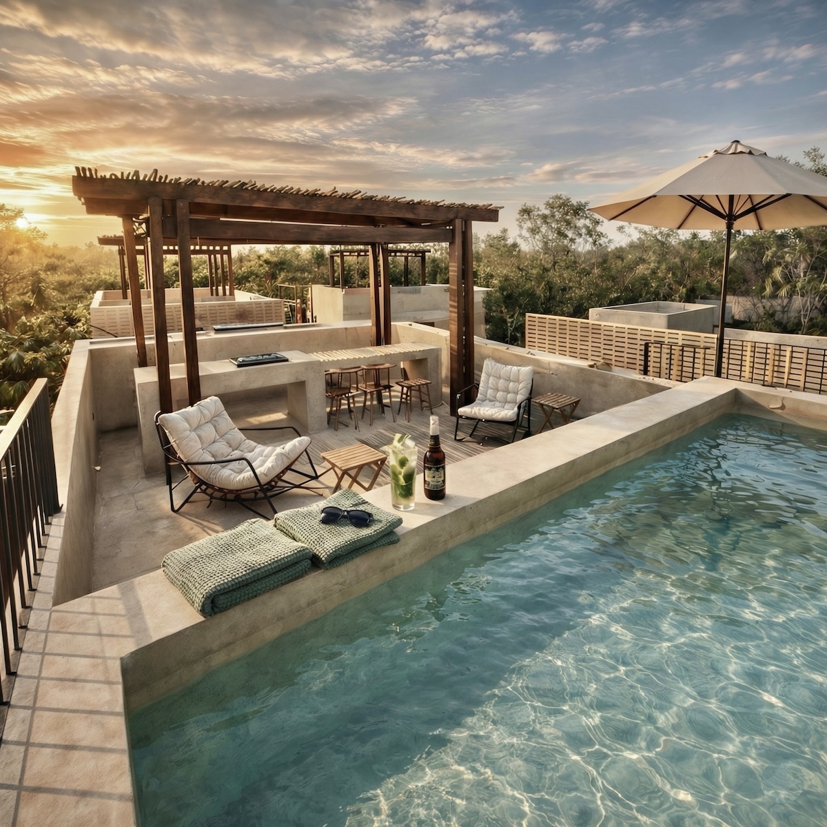 Elegante refugio de 2 dormitorios con oasis en la azotea y piscina