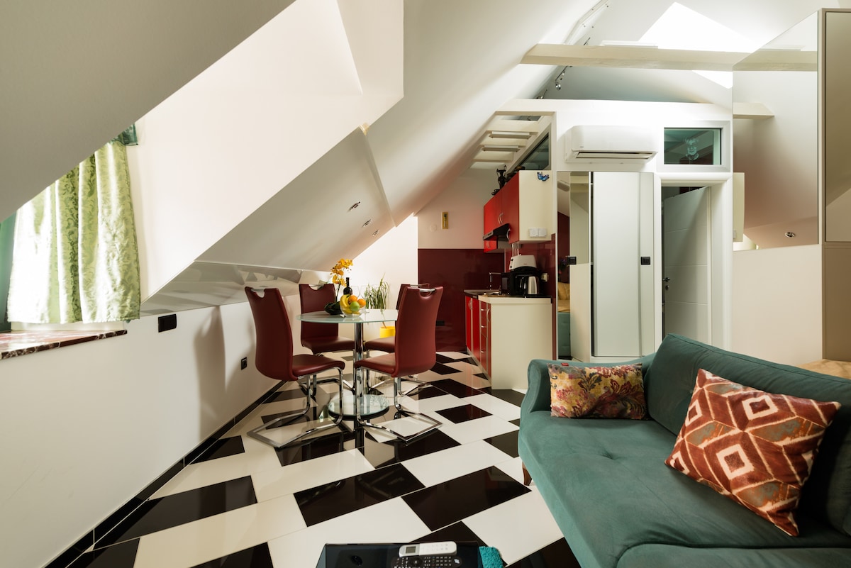 Un encantador escondite en el ático en la parte superior de Varoš, justo debajo del mirador de Vidilica, que ofrece espectaculares vistas a la ciudad y al mar, amaneceres y cielos estrellados a través de ventanas panorámicas en el techo. Los tranquilos paseos por el bosque de Marjan comienzan en la puerta de tu casa, mientras que el casco antiguo de Split está a menos de 10 minutos a pie. Se incluye el aparcamiento privado cerrado. El departamento es ideal para parejas, trabajadores remotos y estancias más largas que buscan comodidad, un entorno tranquilo y una de las ubicaciones más hermosas de Split.