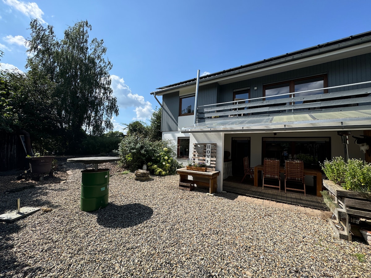 Un apartamento totalmente equipado de 82 m² para 7 personas con jardín y acogedor. acogedor. El alojamiento, incl. El área exterior se puede utilizar por completo. El dormitorio principal tiene 2 camas individuales, 180x200 y un sofá cama 140X200. La cama del segundo dormitorio es de 140x200. Cada habitación tiene un escritorio y wifi. El apartamento tiene una cocina equipada, un gran baño con ducha y sauna. También hay una cama plegable de 90 x 200, una cuna de viaje de 60 x 120 y una trona.