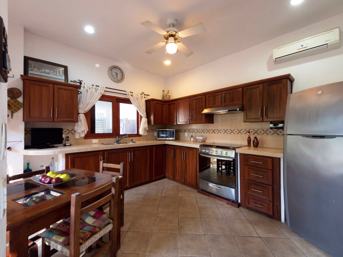 Casa Bella Ola está a tres minutos a pie de la playa y a un minuto de la plaza de la ciudad. La propiedad tiene total privacidad una vez que entras en este hermoso complejo. La suite de arriba es un apartamento independiente que ofrece 1 dormitorio con cómoda ropa de cama de calidad hotelera, cocina completa, baño actualizado y sala de estar exterior cubierta. Vistas a la montaña y al jardín. Casa Bella Ola se encuentra en el corazón de Lo de Marcos y a poca distancia a pie de restaurantes y tiendas. A 15-20 minutos en coche de San Pancho y Sayulita.