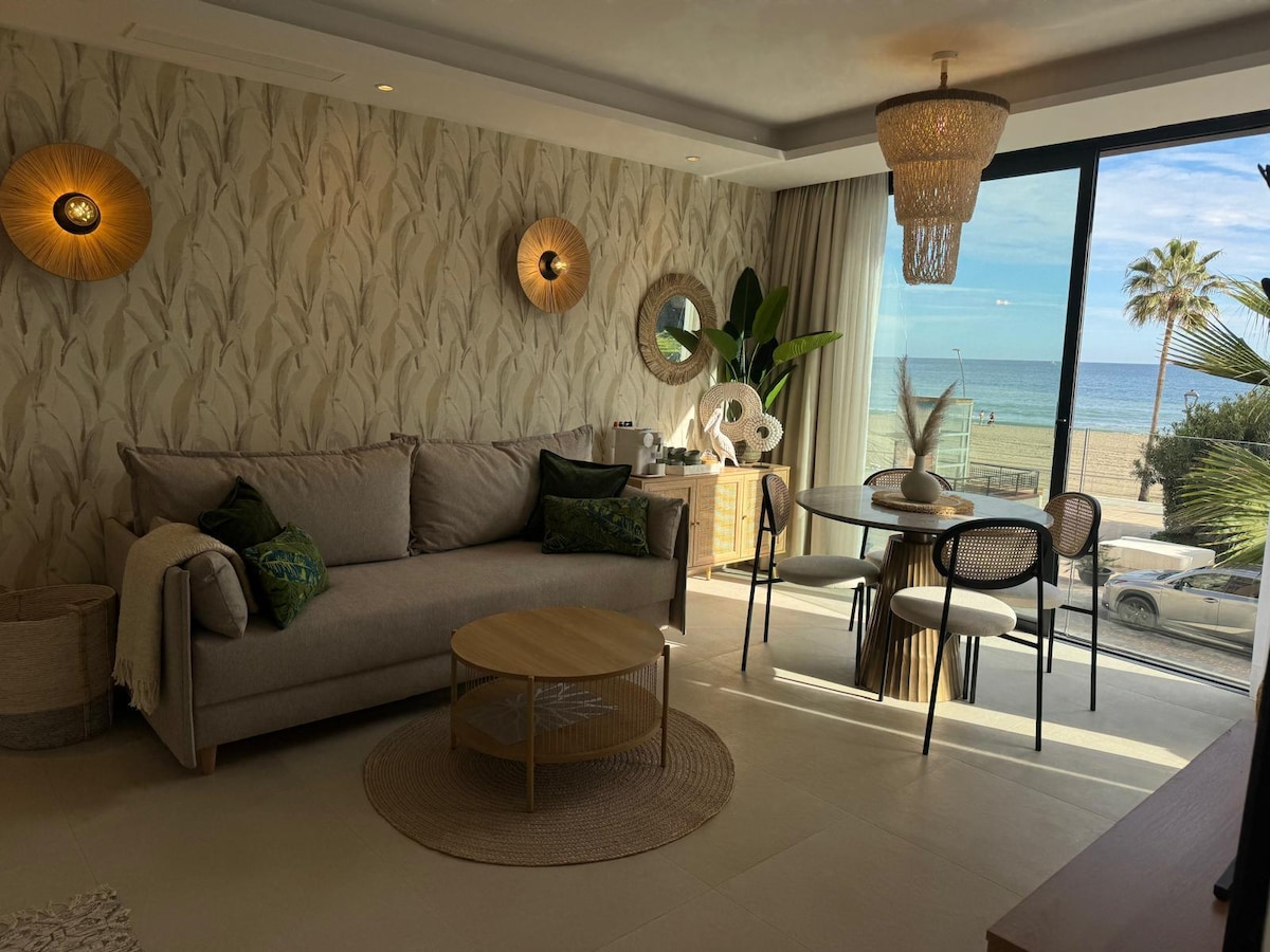 Luminoso apartamento en 1ª línea de playa, con acceso directo al mar 🌊. Terraza con vistas espectaculares, 2 habitaciones, 2 baños (uno en suite), cocina equipada y salón con luz natural. Ideal para familias o parejas que buscan descanso, playa y servicios cerca 🛒. Wifi, aire acondicionado, sábanas, toallas y parking privado incluidos. Zona tranquila. ¡Disfruta Estepona con el mar a tus pies! ☀️