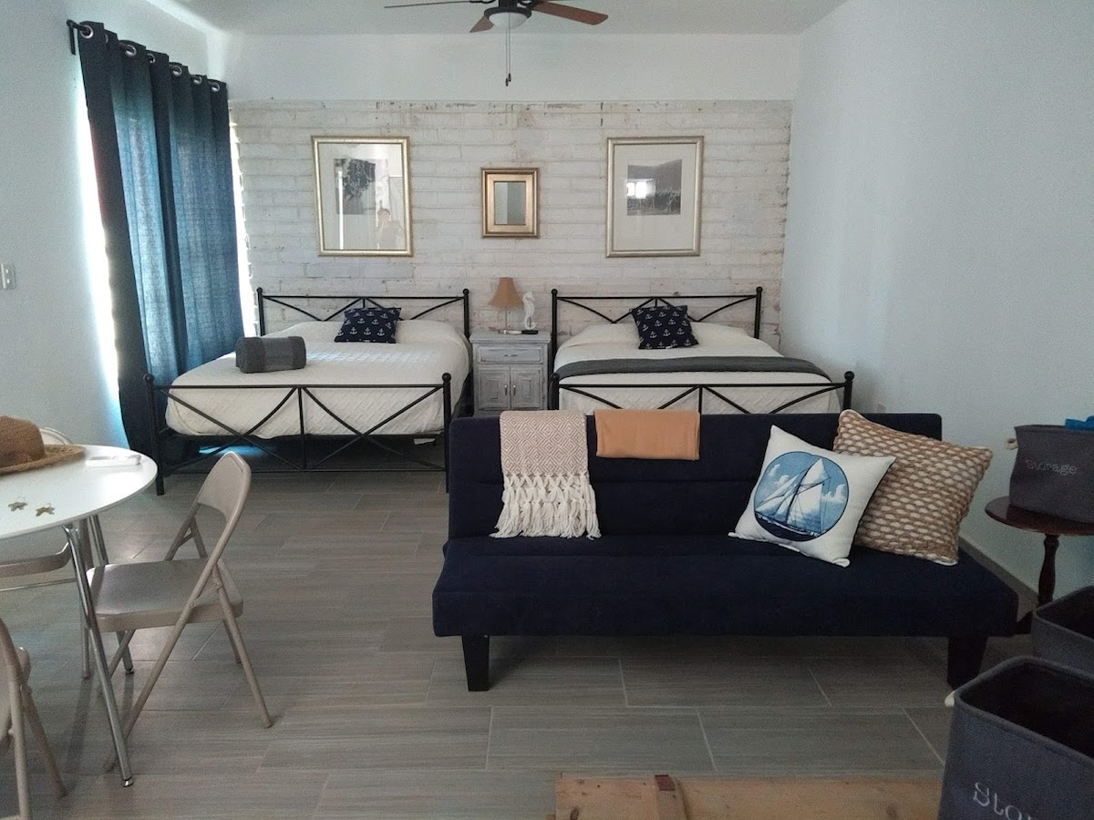 Acogedor Bungalow con acceso controlado, a una cuadra del mar. Cuenta con cocineta, baño, sala de estar y dos camas. Área común para reuniones y comida al aire libre. Cerca del club de Pesca y Campo de Golf de Bahía de Kino.