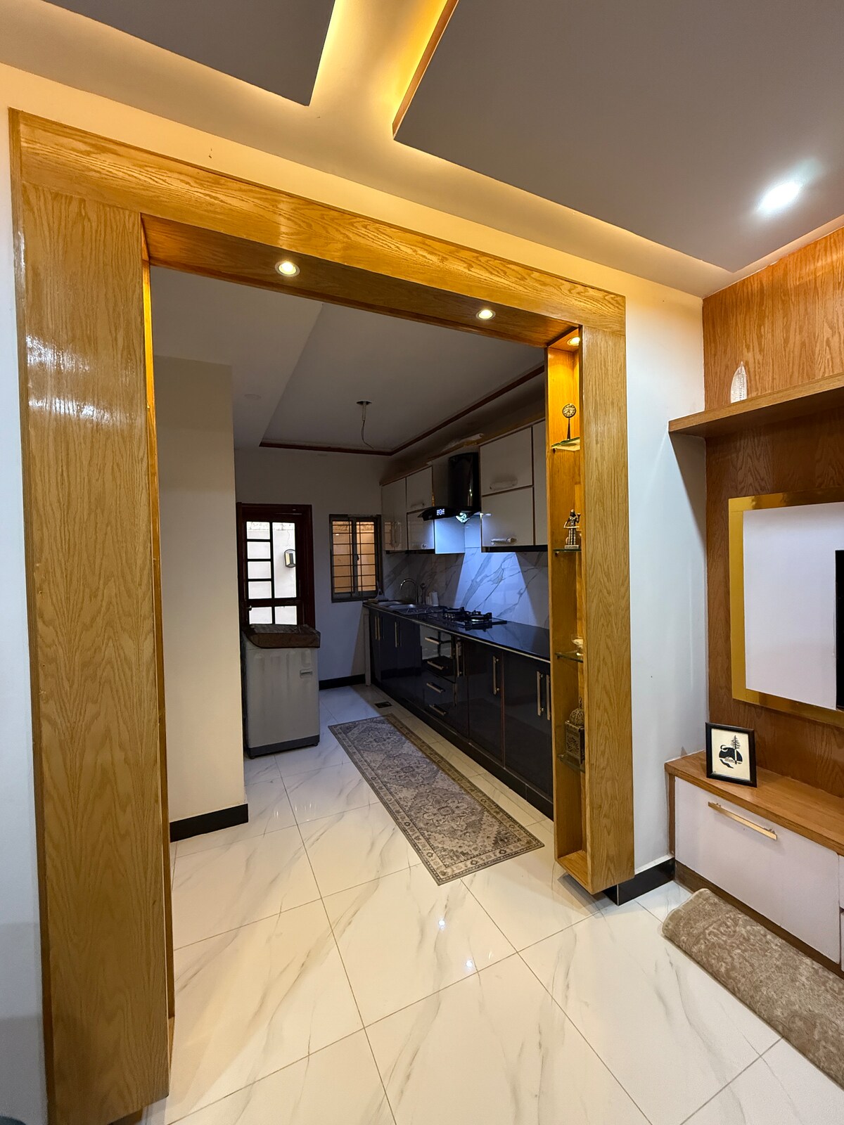 Moderno Airbnb de 2 pisos con 3 camas, 3 baños. Planta baja: dormitorio principal con cama tamaño king, baño adjunto, aire acondicionado, sillón de masaje, amplio salón, comedor y cocina con nevera, dispensador de agua. Primer piso: 1 dormitorio tamaño king con aire acondicionado, 1 dormitorio individual, ambos baños adjuntos. Wifi de alta velocidad, limpio y seguro. Perfecto para familias o viajeros solos que buscan comodidad y conveniencia. Regla OBLIGATORIA de Bahria Town Karachi: Se requiere CNIC/pasaporte para todos los huéspedes.