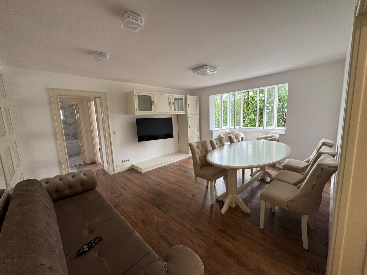 Este apartamento se encuentra en una zona tranquila y ultracentral, en las inmediaciones del parque central Baia Mare, con unas vistas impresionantes. La propiedad cuenta con una gran cantidad de características que la hacen adecuada para todo tipo de huéspedes. El apartamento tiene 70 metros cuadrados y cuenta con una amplia sala de estar con aire acondicionado y Smart UHDTV de 65 pulgadas, un dormitorio con una cama tamaño king con colchón profesional, baño con ducha a ras de suelo, balcón de 10 metros cuadrados, aparcamiento y mucho más.