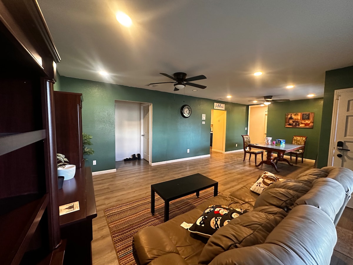 Your family will be close to everything when you stay at this kid and pet friendly, centrally-located place. Minutes to everything! It's a 3 BR 1 BA with 5 beds. 65” Fire smart TV in the living area. Free 393 Mbps fiber Wi-Fi. Two additional 55” Fire smart TV’s. Netflix subscription included! Full size refrigerator and a full sized smart washer and dryer. 5 unit AC with controls for each room, gas BBQ pit, fire pit and huge patio and yard. Pack n play, high chair, board games and cornhole!