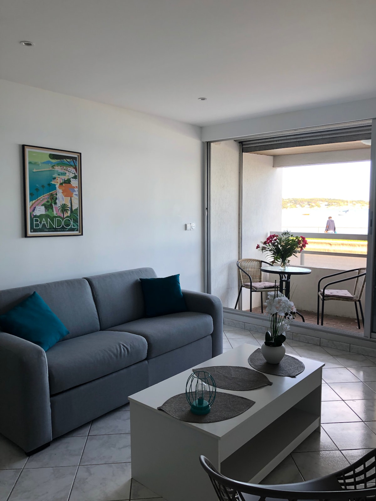Luminoso y cómodo estudio decorado y amueblado con buen gusto que ofrece unas vistas impresionantes de la bahía de Bandol que le permiten disfrutar de la transparencia del agua desde la terraza situada en la cuarta y última planta de la residencia con ascensor. La ropa de cama se cambió en julio de 2023 (sofá cama nuevo de 160 cm), para mejorar la comodidad.