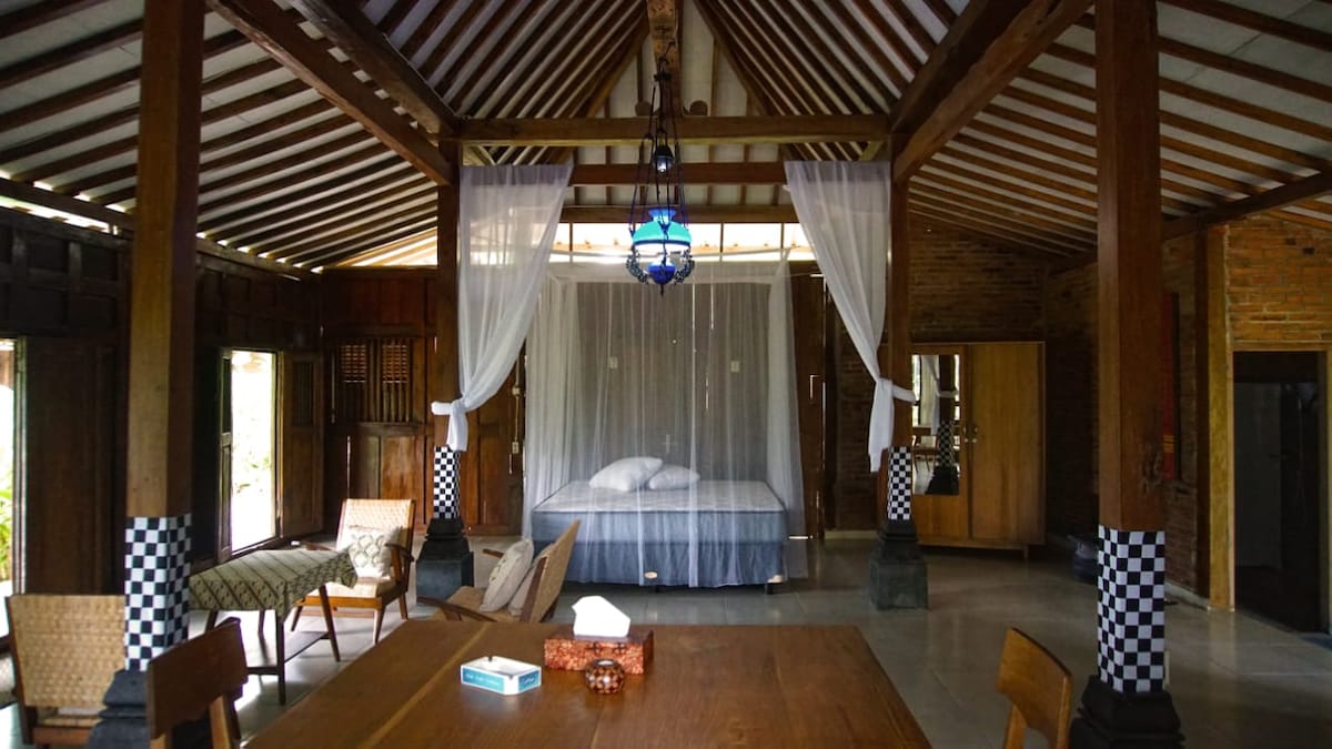 Esta casa de madera tradicional con una amplia terraza y cocina semiabierta ofrece una hermosa vista panorámica sobre los campos de arroz. Aunque está en el campo, está a solo 20 minutos del centro de la ciudad de Jogja. Somos una familia germano-indonesia que vive cerca y que ha estado enamorada de esta zona durante años. La brisa fresca en los campos y los relajantes sonidos de la naturaleza te invitan a relajarte y olvidarte de la vida cotidiana. Se incluye un desayuno saludable y casero.