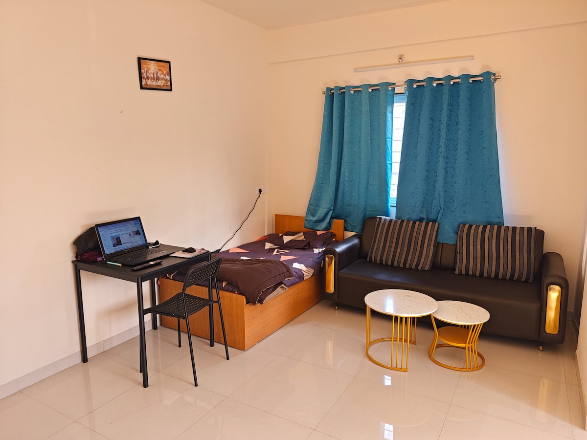 Ofrecemos un 10% de reembolso . No se permite compartir el lugar, todo el privado. Este apartamento es uno de los mejores apartamentos de servicio en el oeste de Pune. La ubicación está cerca de Hinjewadi, Wakad, Baner, Pashan, Sus. NOTA: Sin aire acondicionado Cama tamaño queen Televisión 4K de 43" Inversor Wifi Refrigerador Horno Lavadora automática RO Water Cocina modular utensilios de cocina Mixer Grinder Gas LPG y tienda Tienda de comestibles gratuita Plancha Jabón líquido y lavado a mano Toallas Guardarropa Sofá Ventiladores CCTV Estacionamiento Limpieza todos los días. No se permite comer.