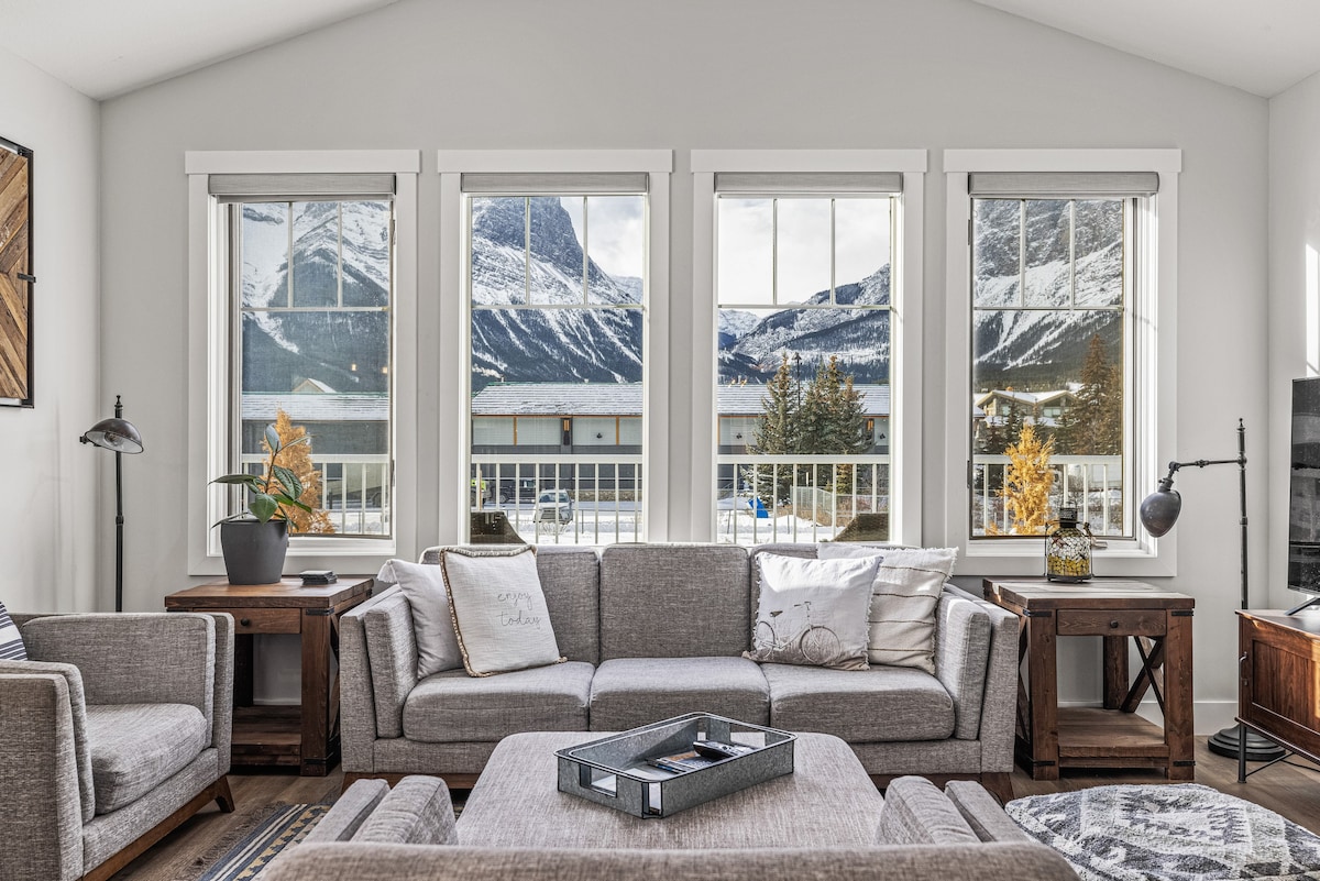 Con vistas a la hermosa montaña Rocosa desde el balcón, el dormitorio y la sala de estar, este nuevo apartamento de un dormitorio recién renovado te ofrece todas las comodidades que esperarías. El dormitorio cuenta con una cómoda cama tamaño king. En la sala de estar hay un sofá cama de alta calidad para acomodar huéspedes adicionales. La chimenea proporciona un ambiente acogedor. Wifi gratuito y TV inteligente con Amazon Prime Video y Shaw TV para tu ocio. ¡Cocina totalmente equipada y bañera profunda con ducha que te hará sentir como en casa!