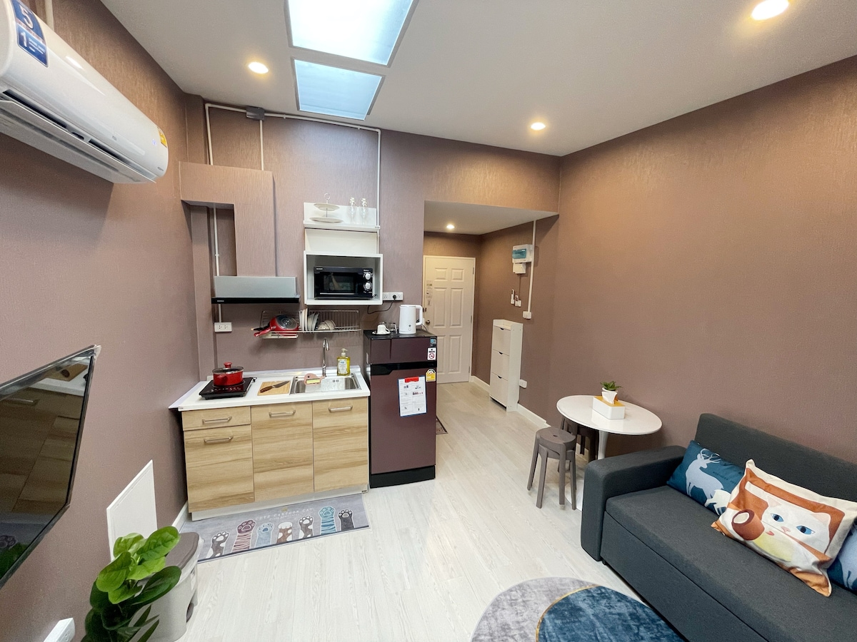 Perfectamente ubicado a solo 1 minuto del centro comercial y a solo 3 minutos a pie del Skytrain, este elegante apartamento recientemente renovado es ideal para estancias cortas y largas. El espacio ofrece WiFi rápido, una cocina totalmente equipada, balcón privado, agua potable ilimitada de un purificador de agua y servicio de limpieza semanal. Con capacidad para un máximo de 3 huéspedes, está diseñado para la comodidad, la comodidad y una estancia sin preocupaciones. Para estancias prolongadas, nos complace ofrecer un 30 % de descuento.