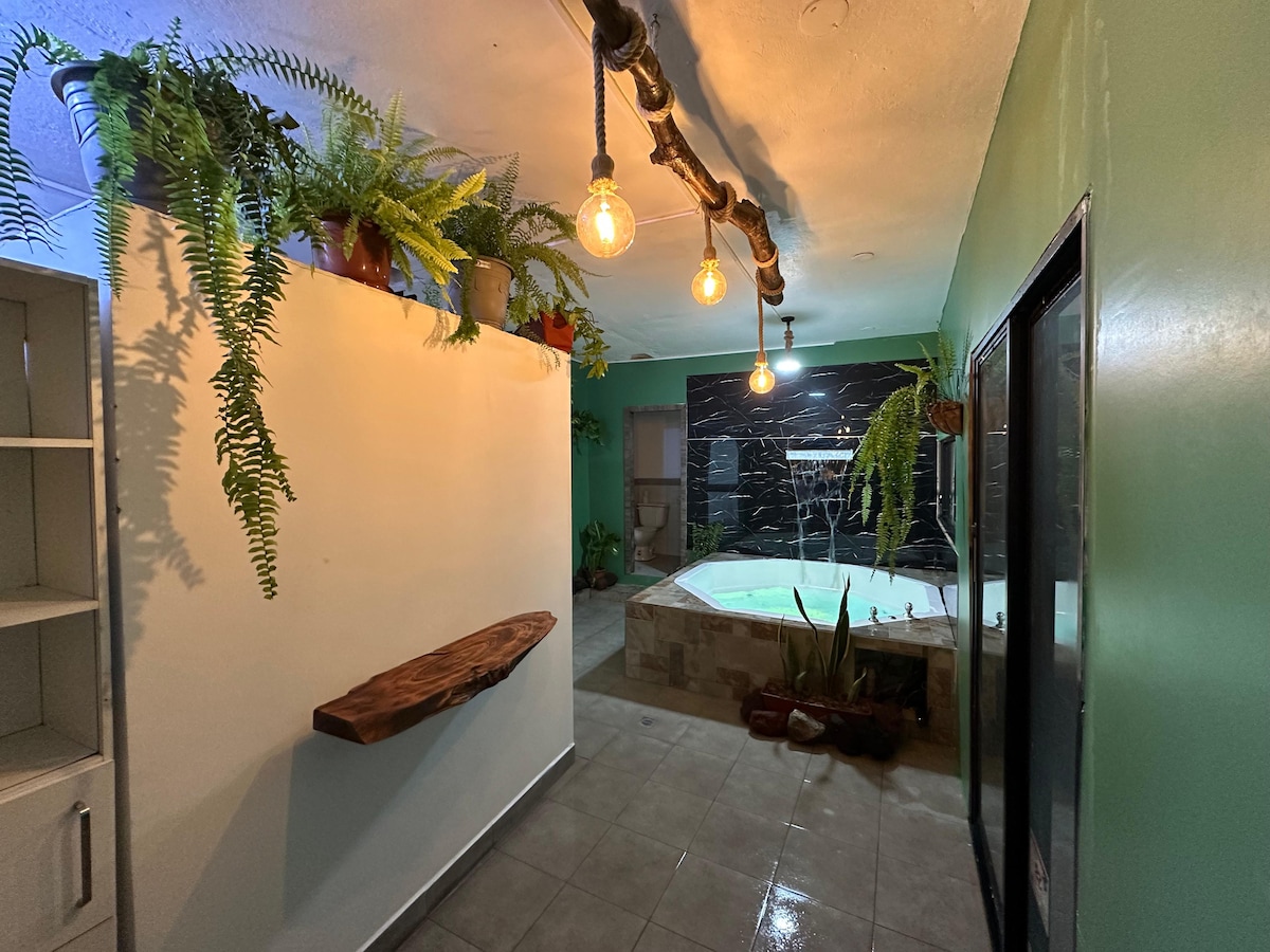 Este Suite independiente es un espacio único: combina confort de 5 estrellas con cama queen, muebles de diseño y aparatos modernos con un patio verde enorme donde puedes relajarte en plena naturaleza. En el huerto puedes cosechar tus propias frutas y vegetales orgánicos (incluyendo café :-). Es ideal para parejas, tal vez con 1 niño (para bebe hay cuna). A las cascadas caminas en 5 min. y al centro llegas en 10 min. en carro. Puedes parquearlo al lado del Suite, con enchufe para carro eléctrico