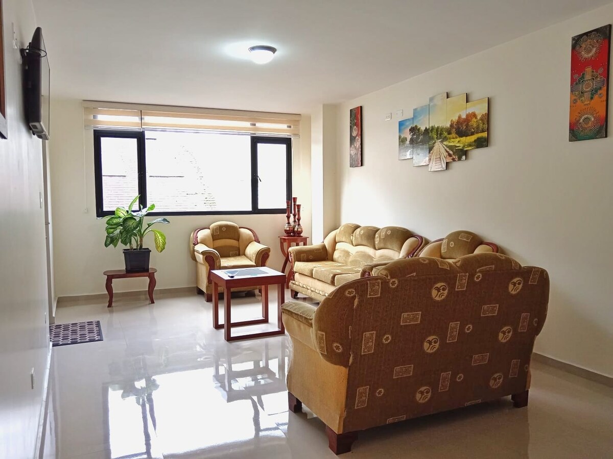 Vive experiencias inolvidables con tu familia o grupo de amigos en este apartamento muy elegante, moderno y con gran estilo. Ubicado en 3er piso, totalmente amoblado, con vista panorámica a la ciudad y montañas; cómodo en zona céntrica y muy segura. Tiene sala, smartv, comedor, cocina, baño social, 3 dormitorios, 2 baños completos, 2 balcones, acceso a la terraza. Wi-Fi, internet, agua caliente (24 horas) garaje automatizado privado para 1 auto. Camas: 3 (2 Queen, 1 Full) Capacidad: 6 huéspedes.