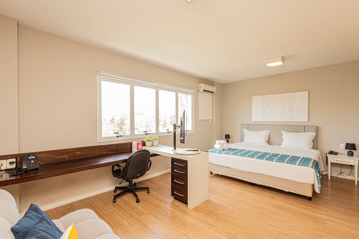 Este es un lugar muy especial, ubicado en el mejor bulevar de la región, está cerca de todo, bancos, farmacias, restaurantes, tres grandes centros comerciales, (Iguatemi, Tamboré y Alphashopping, ubicado al otro lado de la calle), un centro comercial con numerosos servicios y tiendas y es ideal para planificar su visita. También cuenta con piscina climatizada y gimnasio, lo que le da la sensación de tranquilidad de su hogar y la comodidad de un hotel.
