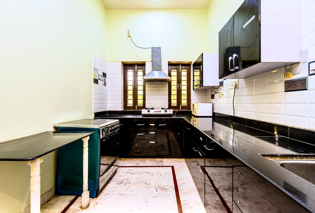 ¡Te damos la bienvenida a tu acogedor alojamiento en Jodhpur! Con tres amplios dormitorios y una sala de estar en el primer piso, cada dormitorio cuenta con una cómoda cama tamaño king y un baño privado adjunto. Disfruta de acceso a una cocina totalmente equipada y un balcón lleno de vegetación exuberante. Ubicado en una zona tranquila, a solo 7,2 km de la estación de tren, a 10 km del aeropuerto y a 6 km de las zonas centrales y del fuerte de Jodhpur, experimentarás una verdadera estancia hogareña en la ciudad para tu familia y amigos.