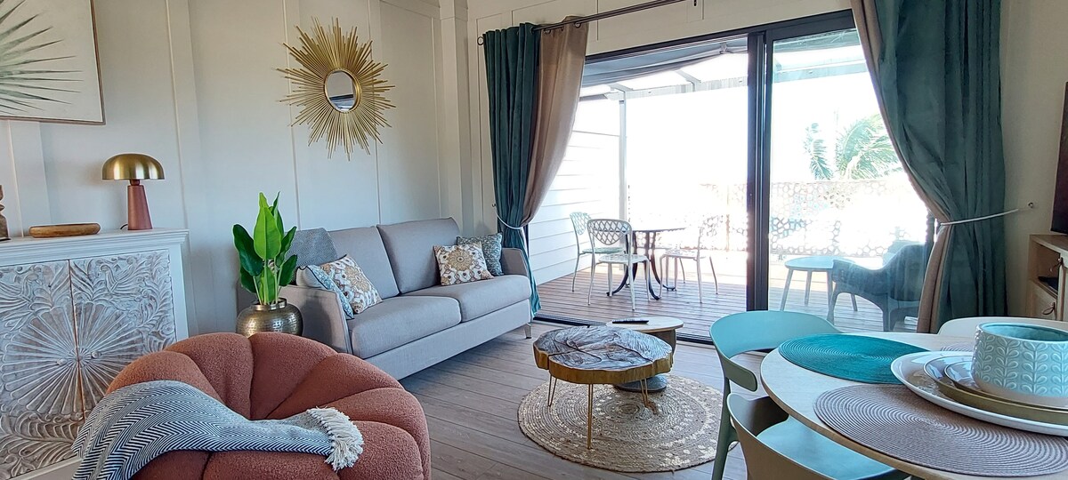 Apartamento de lujo de 50 m2 en la planta baja a orillas de la laguna de St Pierre. Desde su terraza de 30 m2 con vistas al mar se pueden admirar los kitesurfistas, las ballenas en invierno, las puestas de sol o simplemente descansar. Impresionantes vistas al mar de 180°. Apartamento tranquilo, totalmente equipado y decorado con buen gusto. Wifi gratuito Parking privado. Magníficas puestas de sol Posibilidad de alquilar al mismo tiempo otro apartamento en la misma residencia para amigos o familias numerosas