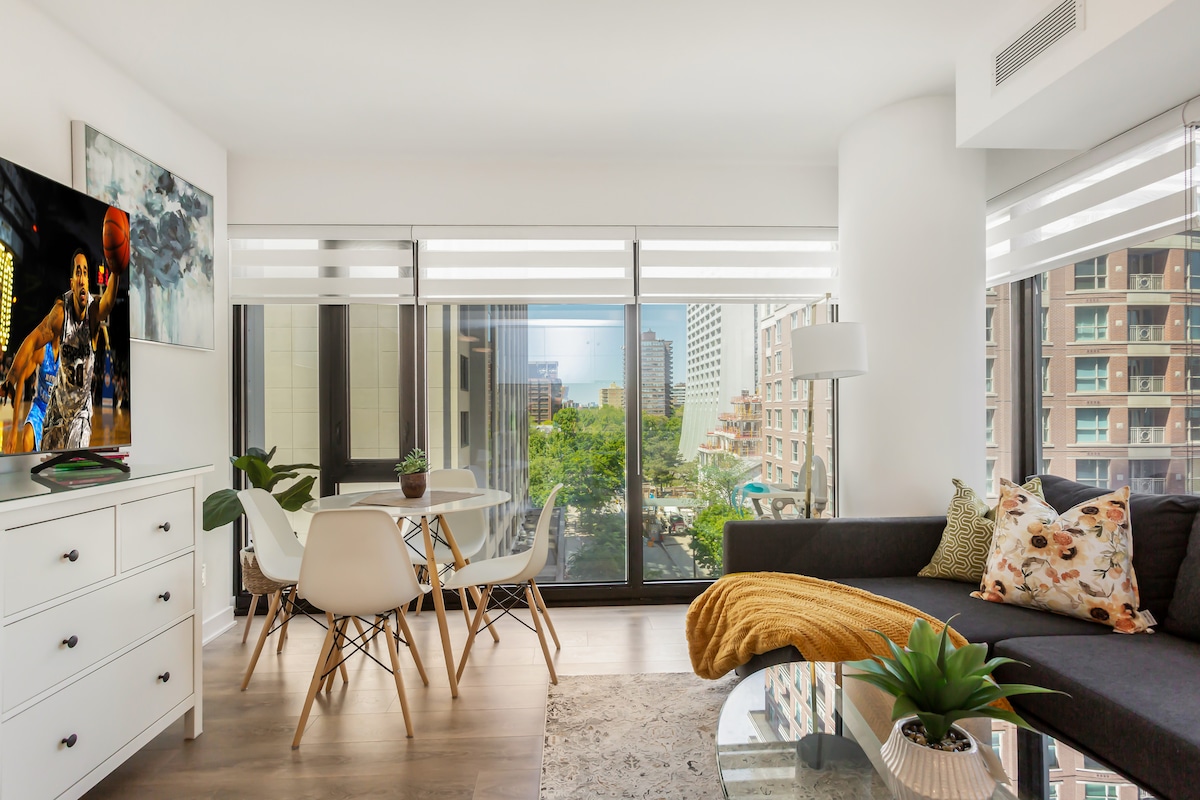 ¡Los críticos han hablado! Esta unidad de cinco estrellas, diseñada profesionalmente, ofrece una experiencia de vida fresca, funcional y bellamente curada. Cada obra de arte y cada accesorio han sido cuidadosamente seleccionados para mejorar la comodidad, el estilo y la energía positiva en todo el espacio. Esta espaciosa suite de un dormitorio y un baño cuenta con una cocina totalmente equipada, áreas abiertas de estar y comedor, y un estudio versátil, perfecto para trabajar de forma remota o relajarse después de un día en la ciudad.