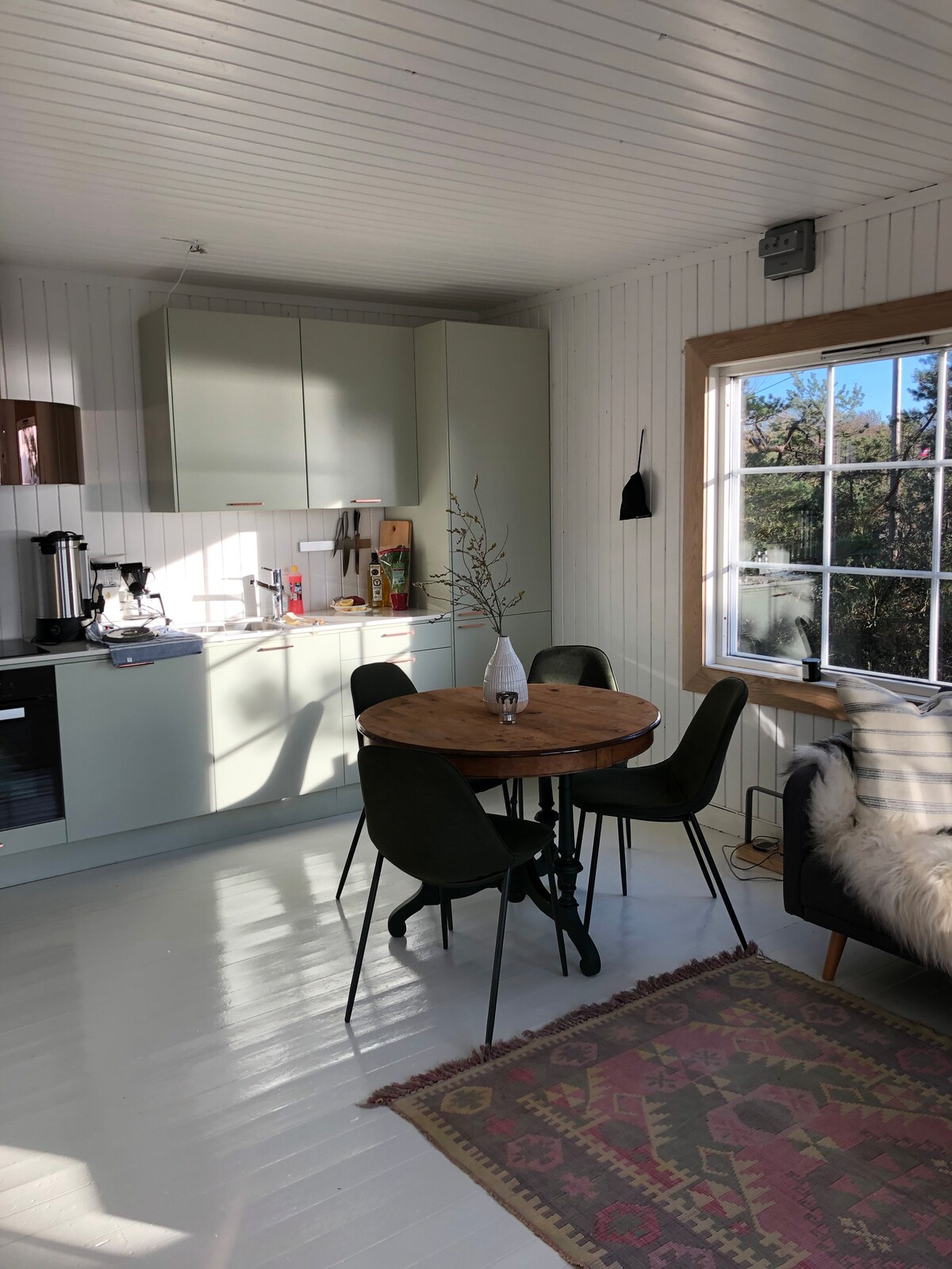 Cocina y salón con sofá cama de 155 cm y vistas al mar. Amplio dormitorio con cama doble de 160 cm. Cocina con horno/placa de inducción, nevera/congelador, fregadero y microondas. Baño con ducha, lavadora y secadora. Balcón y gran patio con césped. Aparcamiento en el exterior. A 10 minutos a pie del agua, con playas, acantilados y un puerto deportivo. El bosque está a 1 minuto detrás de la casa. A 15 minutos en coche del centro, a 10 minutos de las tiendas de Nordby. A 20 minutos de Koster en barco. Zona tranquila.