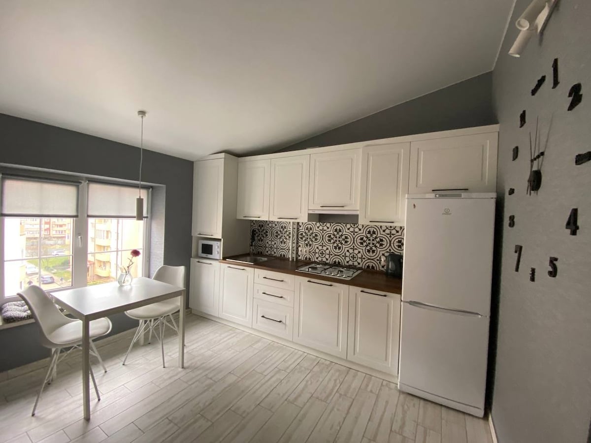 - Apartamento con cocina + baño (separado). - Es posible un descuento para alquileres a largo plazo (para reservaciones semanales -10 %). - Aire acondicionado para refrigeración y calefacción. - La cocina está equipada con los electrodomésticos y utensilios necesarios. - Si es necesario proporcionar documentos oficiales de alquiler que lo acompañen. - Espacio de estacionamiento fuera del edificio bajo videovigilancia alrededor del perímetro. - Se puso en funcionamiento en octubre de 2025.
