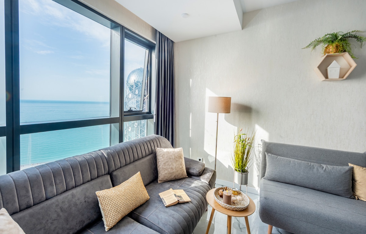 Orbi City, manzana A Este alojamiento único tiene personalidad propia. 🌬️ Aire acondicionado, TV de pantalla plana y mucho más. Apartamento estudio luminoso y elegante en el corazón de Batumi, con vistas al mar y balcón. El alojamiento es ideal para amigos y parejas. Soluciones especiales de limpieza profesional después de cada reserva. 🧺
