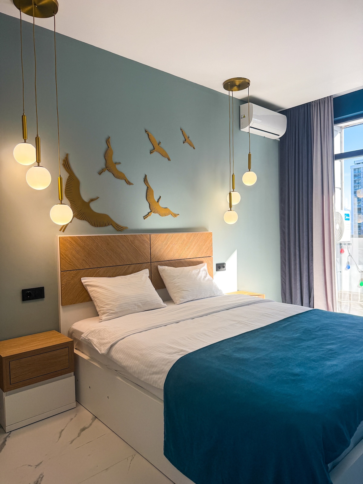 Apartamento con carácter en Pirosmani St. ✨ Un espacio único para aquellos que valoran la estética. El interior, lleno de colores ricos y motivos náuticos, crea un ambiente de centro vacacional. Lo más destacado es una pintura original "Jirafa", un elegante homenaje a Niko Pirosmani. Es fácil relajarse aquí: la paleta suave es agradable a la vista y un enorme sofá te invita a acurrucarte con la televisión inteligente. Un hogar luminoso y armonioso donde el confort moderno se encuentra con el espíritu artístico de Batumi.