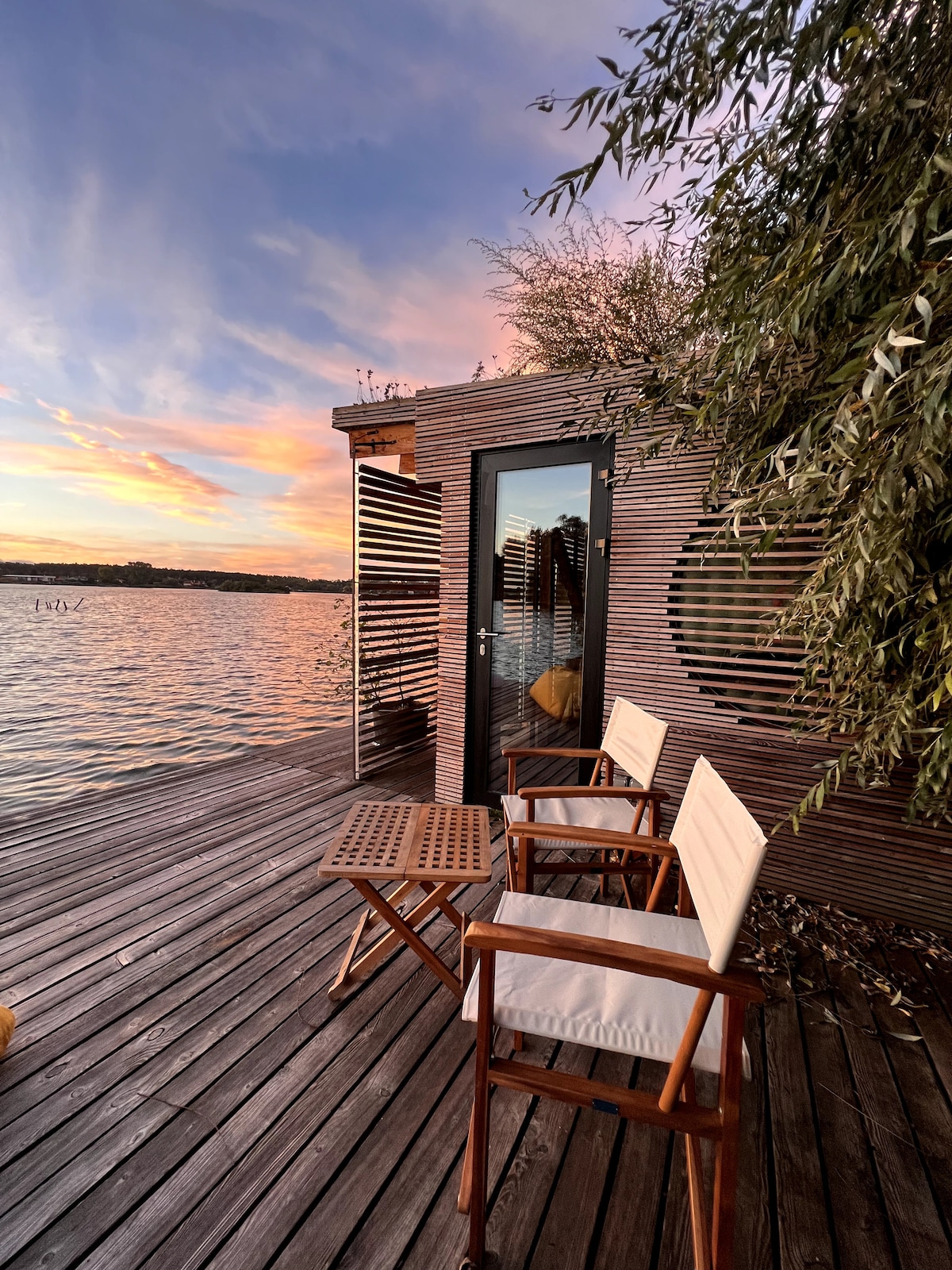 Disfrute de un amanecer romántico sobre el lago, o observe las aves acuáticas desde las inmediaciones y, si lo desea, desde la comodidad de la cama :) El estudio en el lago es originalmente el estudio del arquitecto - autor del edificio. La función de trabajo del estudio ahora ha sido reemplazada por la función recreativa y brinda la oportunidad de probar una arquitectura excepcional en un pequeño volumen, ubicado justo encima de la superficie del lago. Con la pared trasera arqueada del estudio y los edredones suaves, se sentirá como en un nido acogedor :)