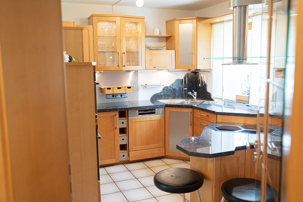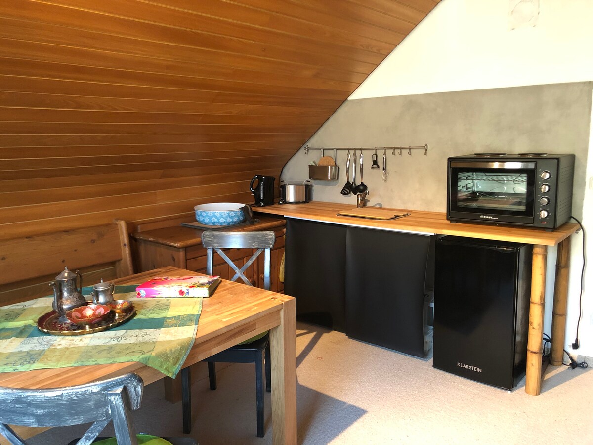 Segunda planta con cocina-comedor y habitación con cama y zona de estar. Las pendientes del techo lo hacen muy acogedor. El baño es excepcional por las baldosas de madera, uno se siente como en una cabaña de montaña. Detrás de la casa, sobre el aparcamiento, se puede utilizar un gran centro de rehabilitación y fitness (gratuito para los huéspedes). Especialmente agradables son las tres saunas si se quiere relajar por la noche (finlandesa, bio e infrarrojos). Los jardines privados no se pueden utilizar por los huéspedes sin permiso. Le pedimos que tenga esto en cuenta (¡privacidad!)