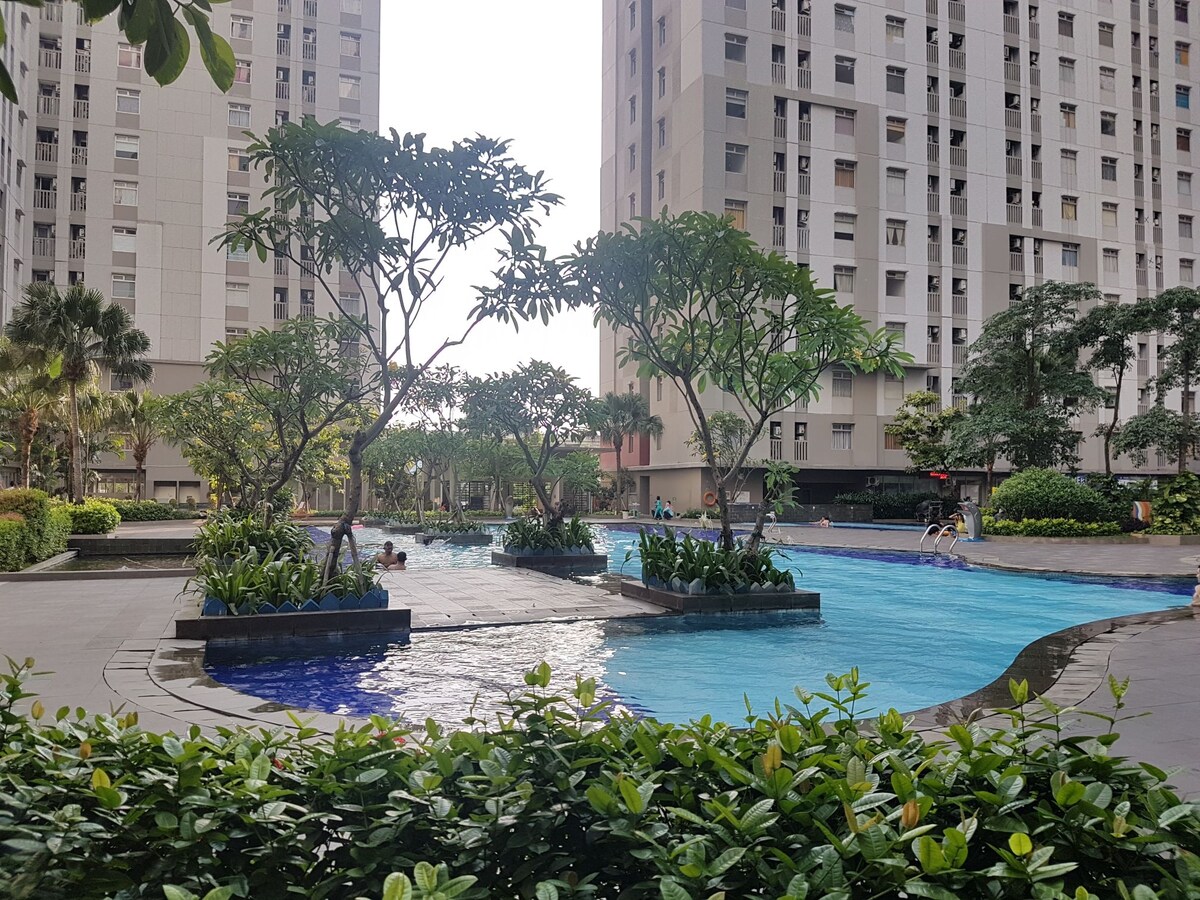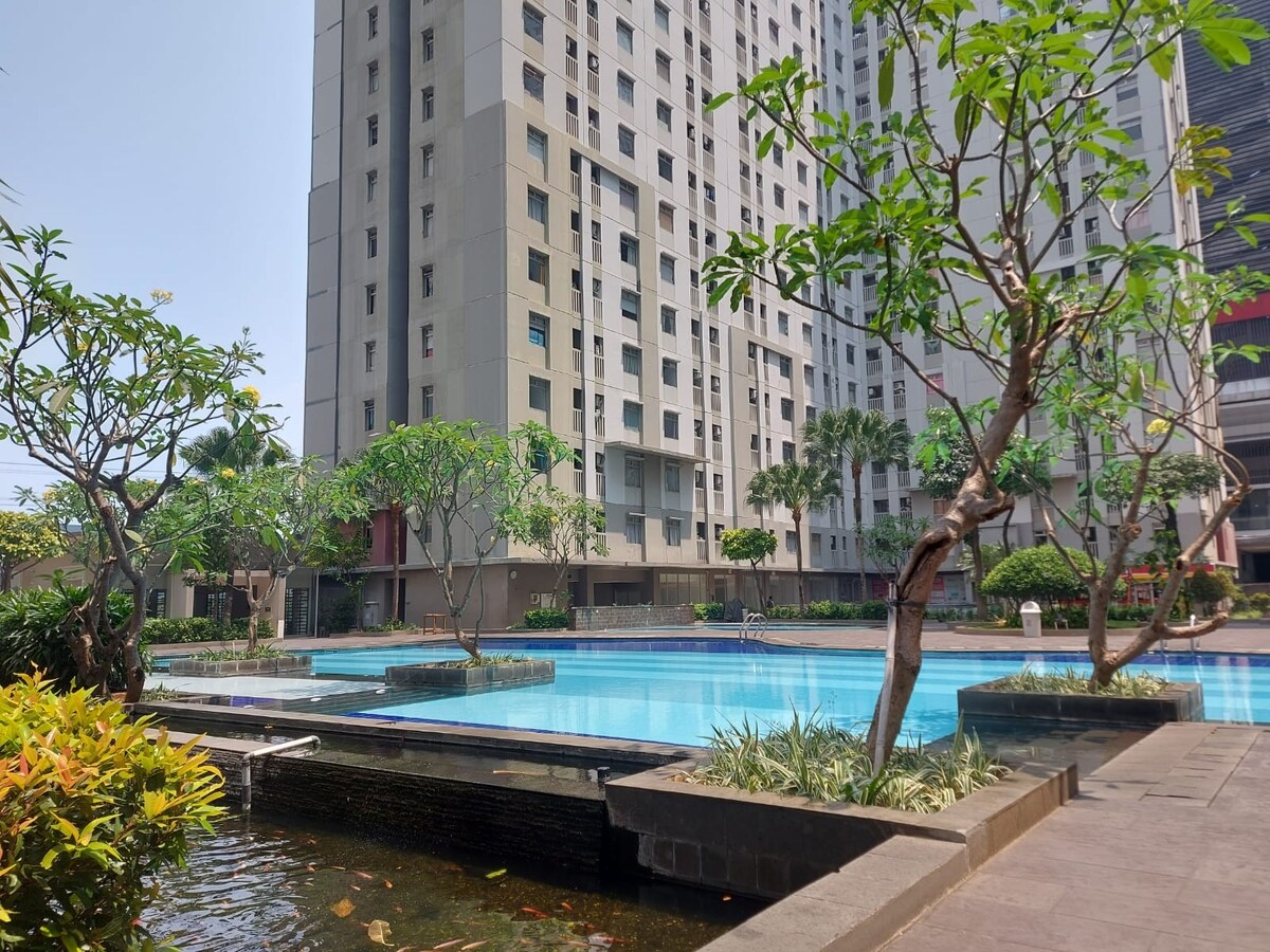 Welcome to my Greenbay Apartment! This superblock with easy access to Transjakarta station. Connected directly to Baywalk Mall with super tenants such as 21 Cineplex, Gold Gym, Farmers Market for your groceries and many more. The apartment's size of 35 sqm corner, renovated to Studio apartment with pool view will fulfill your necessity. Equiped with 100 Mpbs Wifi, Smart TV, sofa bed, fresh linen for new guest and great Kitchen. This great apartment will feel comfortable for 2 persons.