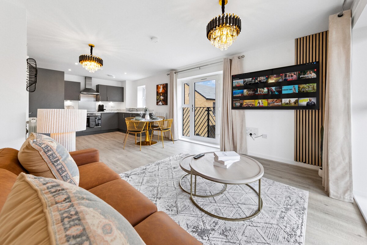 Disfruta de este lugar céntrico y elegante en el corazón de Kent, este opulento piso tiene una terraza privada, sala de estar y 2 lujosas habitaciones. La casa está a 7 minutos en coche del centro comercial Bluewater, que consta de tiendas minoristas y el hospital Darrent Valley. La casa está cerca de la estación internacional de Ebbsfleet y a 15 minutos de las atracciones de la ciudad de Londres/Westend. Netflix y Amazon Prime, banda ancha rápida ilimitada y suscripción a cielo completo. La cocina está totalmente equipada con todos los utensilios domésticos.