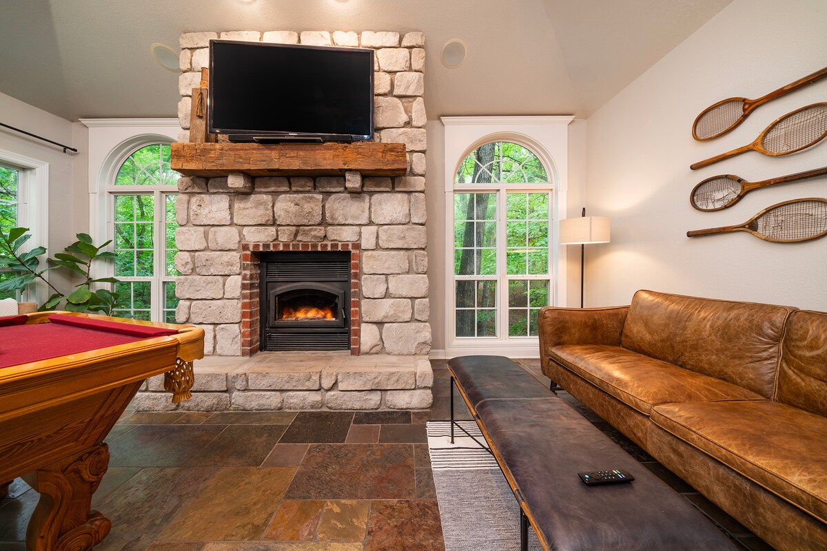 Impresionante cabaña, camas tamaño king, sala de juegos y chimenea