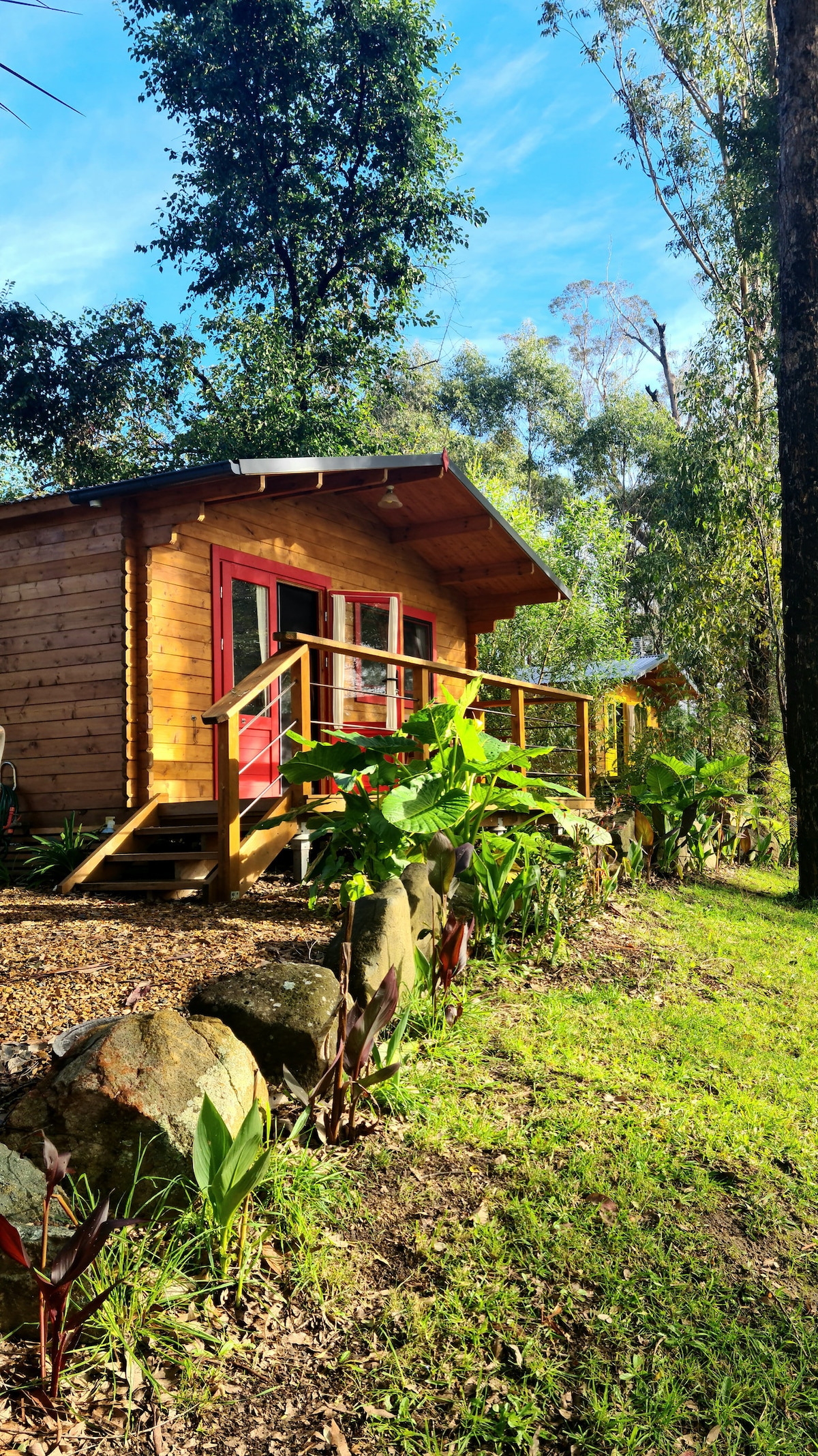 The Rainforest Cabin is relaxing haven nestled in nature on our farm. It is one of a pair of cabins, each private and with their own character. Your own home close to all the delights of the far south coast. The cabin has a deck overlooking the chain of ponds leading to the Lily Pond dam below. There is a private kitchenette and the shared Sunny Kitchen cabin. Its a lovely artistic space to relax and rewind and enjoy the landscaped gardens. The handmade crockery is made in my farm studio.