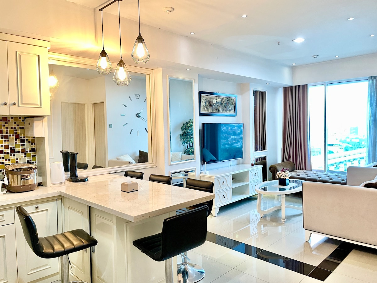 Wifi de alta velocidad. Netflix. ¡Descuento por estancias largas! 🚭 La única suite única en esquina de 2 BR con diseño industrial chic. Ya sea que te quedes por negocios o por fin de semana, garantizaremos tu estancia cómoda. Esta unidad de autoservicio PARA NO FUMADORES ubicada en 32nd fl, con increíble vista al paisaje de Bekasi, carretera elevada MBZ y tren de alta velocidad LRT +. Cuenta con electricidad de 2200 vatios, aire acondicionado, nevera y utensilios de cocina completos para 4 personas. Lagoon Mall se encuentra justo debajo del apartamento. El estacionamiento NO es gratuito.