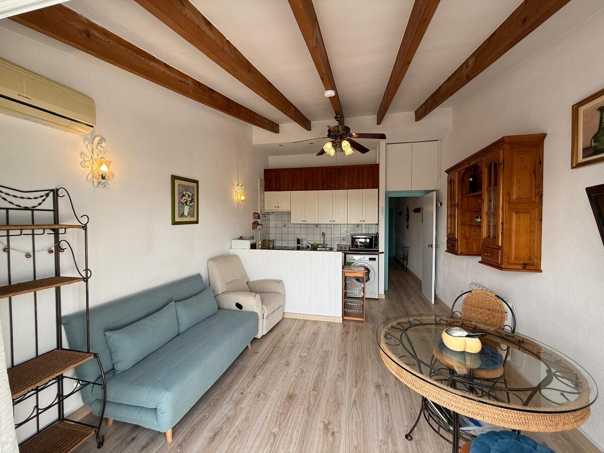 A 5 minutos de la playa y la plaza de la iglesia. Terraza con vistas al mar, dormitorio doble con aire acondicionado, dormitorio individual, baño y cocina equipada. Parking público a 1 minuto. Ideal para disfrutar del mar y el centro. 5 min from the beach and church square. Terrace with sea views, double bedroom with AC, single bedroom, bathroom, and equipped kitchen. Public parking 1 min away. Perfect for enjoying the sea and town center.