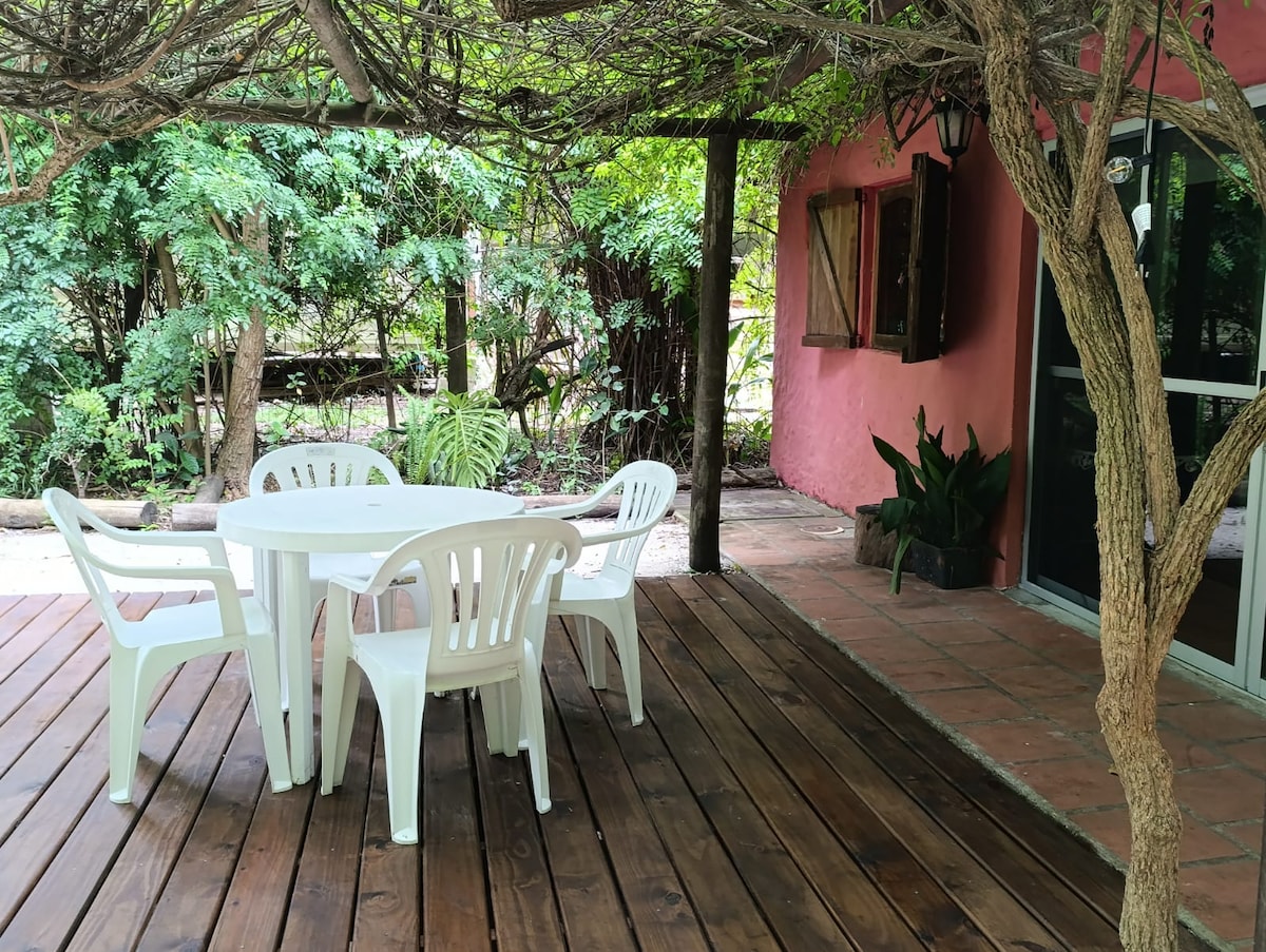 No es apartamento! Tiene barbacoa y jardín propio A 100 metros del mar, para disfrutar de una cómoda estadía en un ambiente seguro y con el estilo único de La Floresta. Muy bien equipada: wifi, aire acondicionado, heladera, microondas, jarra eléctrica, secador de cabello, cochera techada, a pasos del centro comercial y cerca de todos los servicios. Cochera. Gran jardín de 400 mts donde se disfruta el sonido del mar y los pajaros. Portón de ingreso se comparte con la casa principal