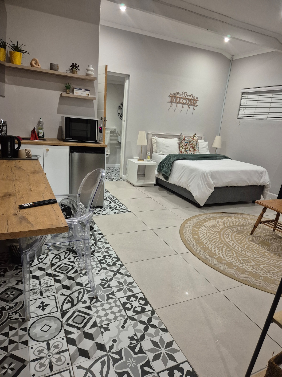 Habitación moderna de 20 metros cuadrados con suelo laminado. Totalmente amueblado con cocina americana que incluye microondas, hervidor de agua, tostadora y nevera bar. Se proporcionan cubiertos, vajilla, té, café y leche. Televisión con DSTV. Wifi de fibra. Baño en suite con ducha (toallas y jabón incluidos). Pequeño patio con jardín. Aparcamiento seguro fuera de la carretera. Lamentablemente, no se admiten mascotas. Centro de Durbanville con tiendas, restaurantes, etc. a 2 minutos. Ruta del vino de Durbanville a 5 minutos. Junto al campo de golf de Durbanville. A 25 minutos de Ciudad del Cabo/Stellenbosch.