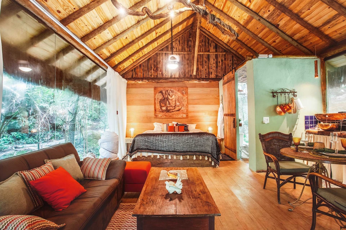 Inmerso en la naturaleza, un refugio romántico rústico, el techo ecológico con un aspecto encantador proporciona un confort térmico sin igual. Agua corriente suave, relajación única, aprovecha la oportunidad para poner los pies en el agua y sentir la corriente. Mirador con vista a los valles y colinas, puesta de sol; en noches claras la luna, este escenario es perfecto para fotos inolvidables ofrece una relajación sin igual ¡Increíble! Un vecino lejano, ¡la sensación de privacidad y conexión sigue siendo aún más intensa! ❤️ 💘❤️