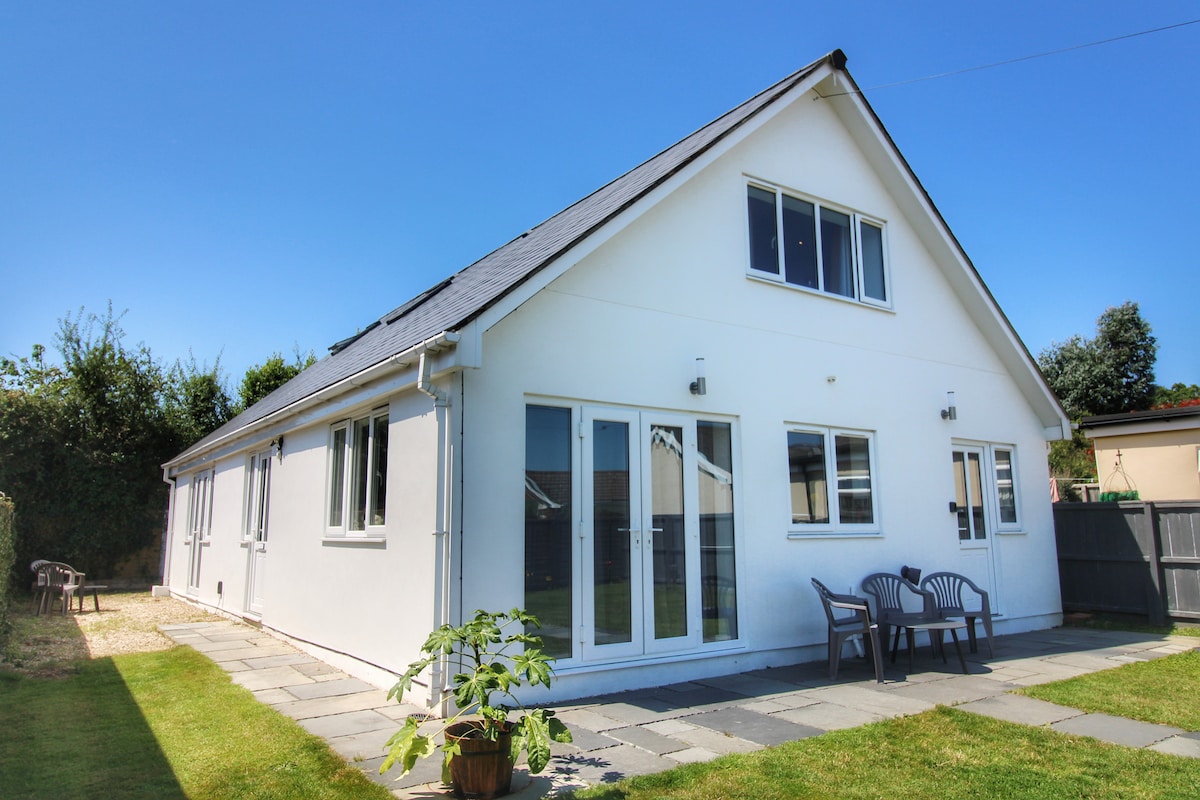 Stylish bungalow in the centre of the village of Bembridge. Short walk to shops, cafes, sandy beaches, harbour, coastal path. 4 bedrooms (master with en-suite), family bathroom, large open plan sitting room with smart TV. Bi-folds opening to patio with table, chairs, sofa, BBQ. Kitchen with microwave, dishwasher, washing machine, Nespresso. Large south facing garden with summer house & outdoor games. Playroom with table tennis table. Off-street parking for 2 cars. Ferry discounts available.