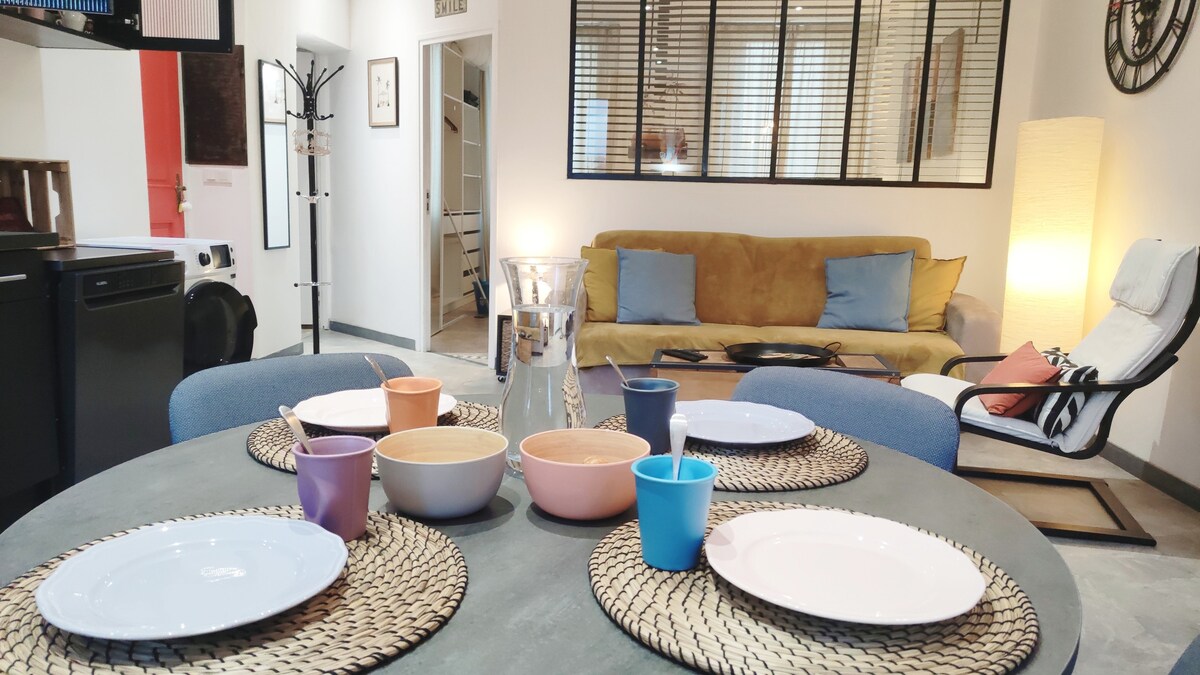 ☀︎ T2 de 42 m2 totalmente renovado con aire acondicionado y una hermosa terraza situada en el centro de la ciudad de Bandol. 1.ª planta de una casa de pueblo totalmente rehabilitada. ☀︎ Orientación sur, soleado. Amueblado con todas las comodidades, ropa de cama bultex. Doble lavabo en el cuarto de baño. ¡Terraza con tumbona, sombrilla! ☀︎ puerto, tiendas, restaurante, bar playas a 50 m del apartamento . ☀︎ Ubicación ideal para ir andando a todas partes. El encanto de un pueblo provenzal. Aparcamiento cerca. Visita nuestra página ☀Instagram @thisisbandol