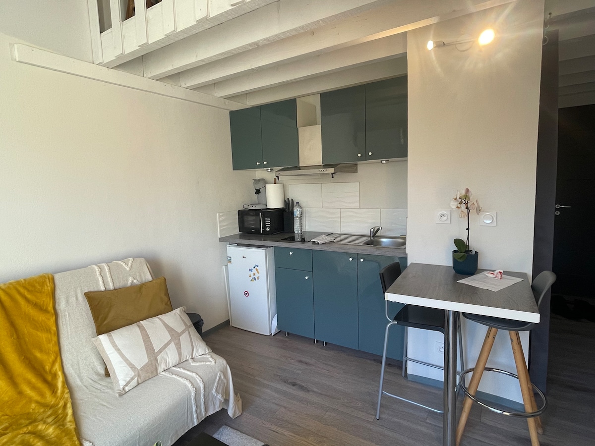 Le Cocon de la Villa Ola Encantadora habitación con cama doble, cocina americana equipada y baño. Pequeño plus: terraza privada orientada al sur, ideal para disfrutar de una zona de comedor al aire libre. 📍Ubicación: • Situada en una calle tranquila de un solo sentido. • A solo 15 minutos a pie del centro de la ciudad de Mont-de-Marsan y del pueblo de Saint-Pierre-du-Mont. • Frente al INSPE y a cerca del IUT. 🚗 Conveniente: estacionamiento gratuito cercano. ¡Un verdadero nido para una estadía agradable!