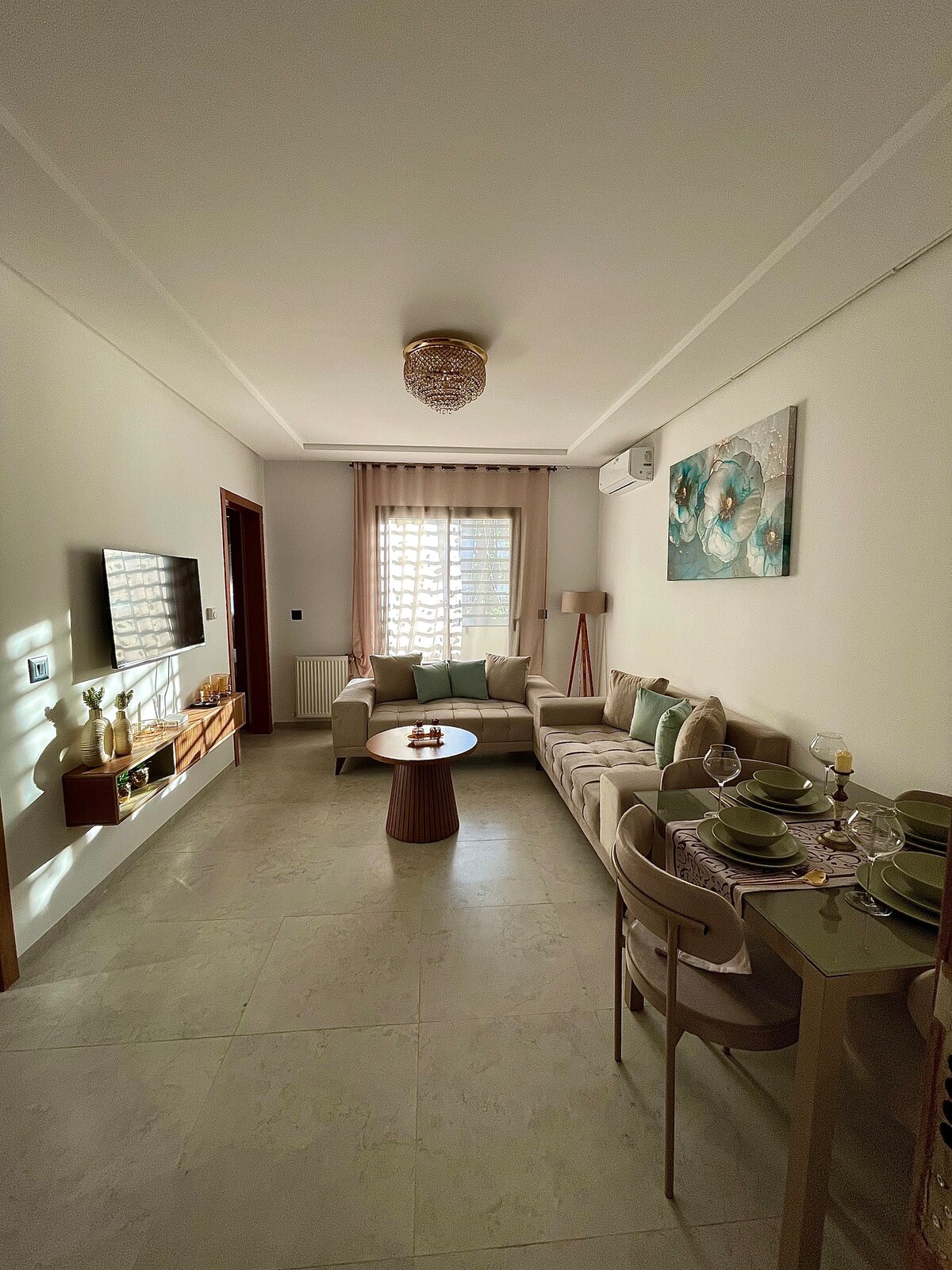 Relájese en este alojamiento tranquilo y acogedor, lujosamente equipado y con una decoración armoniosa que garantiza una estancia agradable. El apartamento se encuentra en una zona residencial tranquila, consta de una sala de estar con sofá cama, un dormitorio con balcón y una cocina americana bien equipada. 📍Ubicado cerca de todas las comodidades: Carrefour, restaurantes, cafeterías, salones, gimnasio, farmacia… El aeropuerto de Túnez-Cartago está a 5 minutos.
