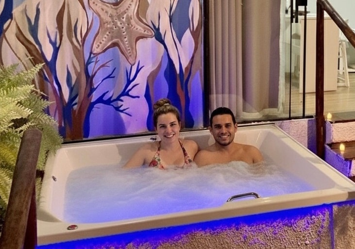 🧜♀️🪸 Cabana moderna romântica para casais, um bebê e pets em Bertioga, com: Jacuzzi, lareira, churrasqueira, balanço e a 3 minutos de carro da praia (15 mim a pé)! Veja os detalhes 👇