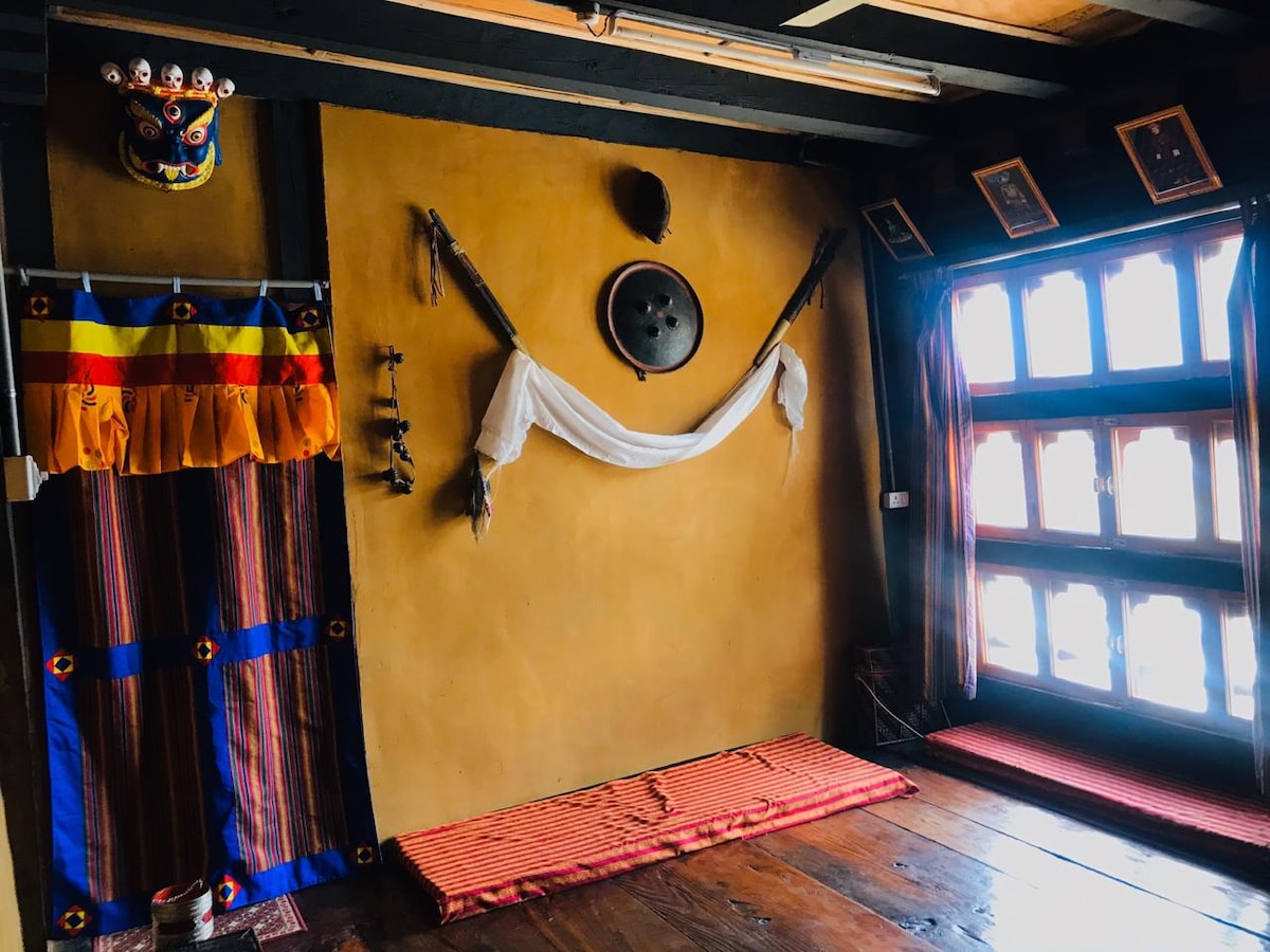 Escondido en el pueblo de Jawana (que significa el pueblo debajo del acantilado), a unos 20 minutos en coche por un camino rural desde la carretera principal cerca de Punakha Dzong, se encuentra un tesoro butanés llamado Aum Wangmo Homestay. La granja de 5 acres ha estado en la familia de Aum Wangmo durante unos 200 años, desde la época de su tatarabuelo. Bien mantenida, la granja ha sido reparada, ampliada y renovada para albergar dos baños modernos y cinco habitaciones para alojar cómodamente a 10 turistas.