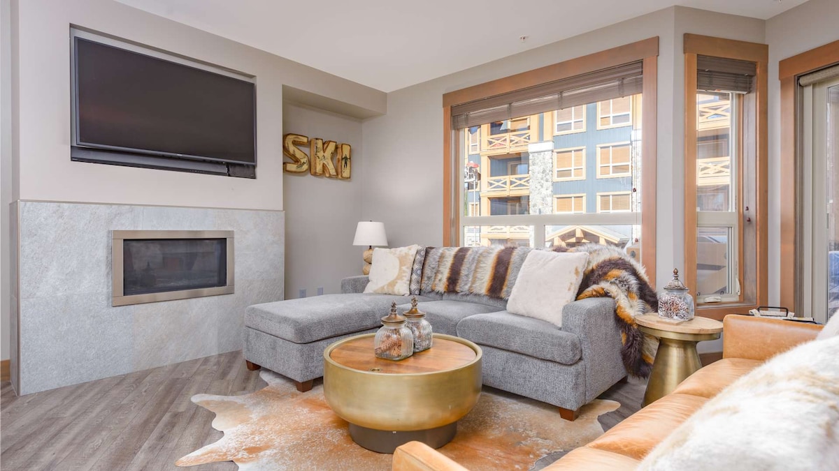 Stonegate Residences offer unparalleled convenience with ski-in access and an easy walk up through the ski tunnel to the restaurants and shops. Careless ease is facilitated, while those opting to drive are provided with an underground parking spot. Stonegate unit A102, situated on the first floor, provides a serene courtyard view with glimpses of distant mountains.