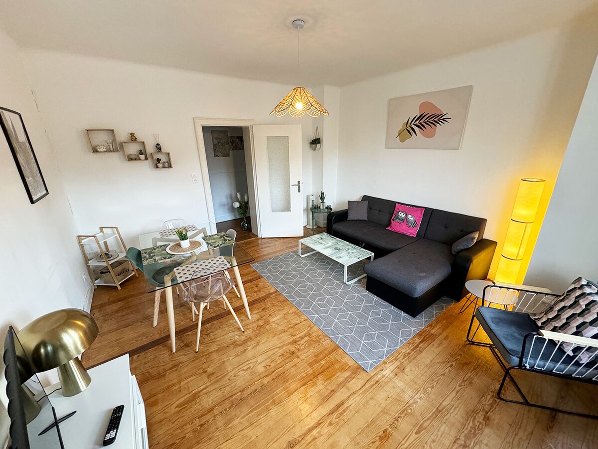 Parfait pour quelques jours à Strasbourg! Appartement cosy, moderne et lumineux, wifi gratuit, équipé de la fibre. Cuisine ouverte toute équipée (micro-onde, four, frigo..), chambre séparée avec lit double, salon avec canapé convertible, salle de bain avec douche (sèche-cheveux, lave-linge) et balcon Logement fonctionnel, bien situé, proche de toutes commodités. Arrêt de bus à 5 min à pieds ( direct au centre ville de Strasbourg), gare à 2 min, proche du Wacken, des institutions européennes.
