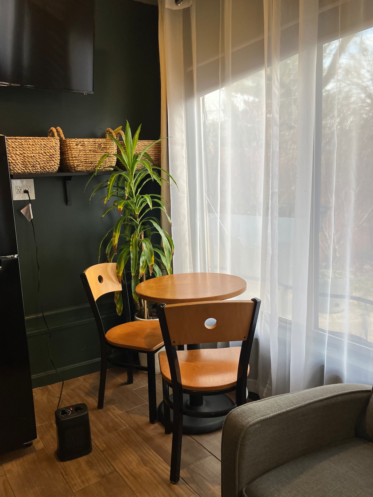Enter from the backyard, into a shared laundry room with a hallway headed to your suite on your left. In that hall is a private restroom, right outside the door of your guest apartment suite. In the suite is a common room with a table and chairs for 2, coat/shoe rack, a queen bed and a pull out twin trundle. The large bedroom has a king bed, TV, closet, coffee/microwave cart and couch. The shared space, has a large fridge and a stainless steel sink for your use.