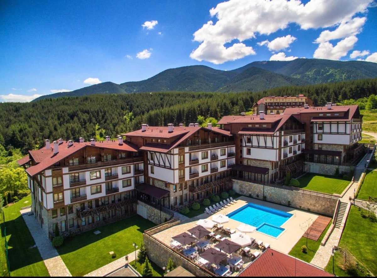 🏔️ Amplio balcón con vistas a la montaña ⛳ A pocos pasos de Pirin Golf ♨️ A 15 minutos en auto de las aguas termales de Banya 🥾 Montaña / Pistas de esquí / Manantiales naturales: a 20 minutos a pie 🎿 Teleférico de Bansko - 6 km 🍳 Cocina: estufa, microondas, tostadora, platos 🧺 Lavadora 🔥 Calentador nuevo: agua limpia y caliente ❄️ Aire acondicionado nuevo (frío/calor) + ionizador de aire 🔇 Puerta de entrada insonorizada 🅿️ Estacionamiento gratuito 🏊 Piscina en las instalaciones del complejo 🚲 Triciclo gratuito para explorar 📺 Televisión HDR 10+ de 65 pulgadas WiFi 📶 de 300 Mbps