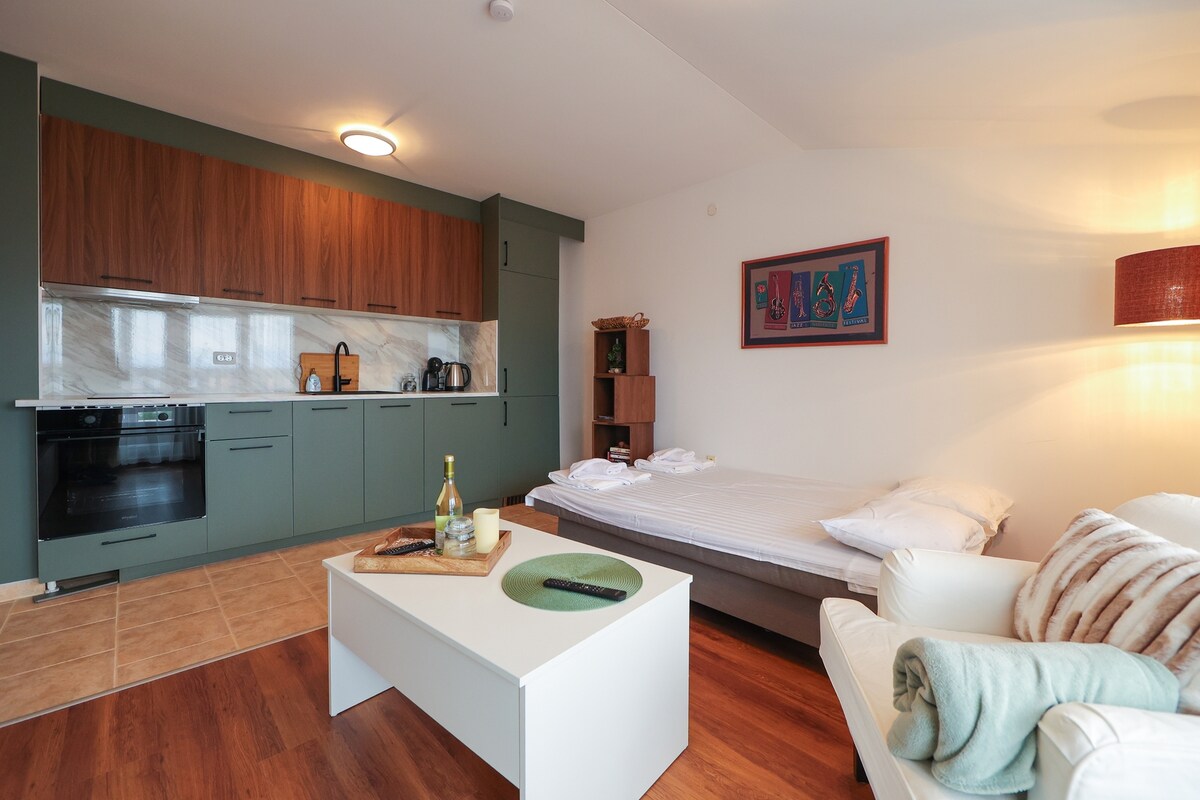Nuestro estudio te ofrece todo lo que necesitas para una estadía relajante. Cuenta con una cocina totalmente equipada, un baño con bañera y un área de dormitorio separada por persianas para mayor privacidad. La sala de estar incluye un cómodo sofá cama, perfecto para dos niños o adultos. Disfruta de más comodidades como aire acondicionado, wifi privado**, TV inteligente y 130 canales por cable. Comienza el día en la mesa del bar con una taza de café mientras ves salir el sol sobre la montaña, una manera perfecta de comenzar el día.