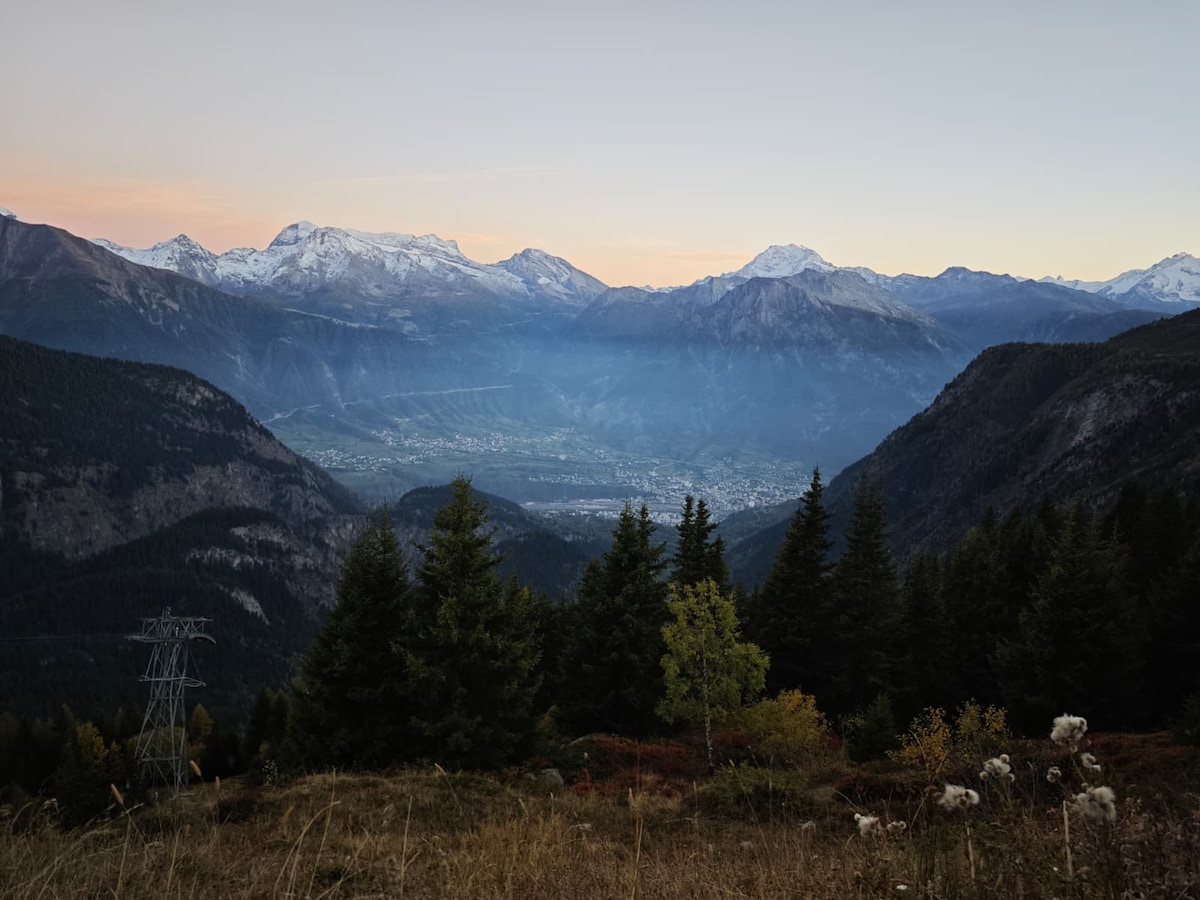 El apartamento está situado en la colina de Biela, en una ubicación única sobre Brig con vistas al valle del Ródano y las montañas circundantes. Un acogedor jardín rodeado de bosques, prados y una acequia abierta (Suone, Bisse) separa la propiedad de la adyacente reserva natural «Achera Biela» (estepa rocosa del Valais con vegetación seca). Se puede llegar a la casa desde el aparcamiento a través de un corto camino forestal (200 m y apto para maletas con ruedas).