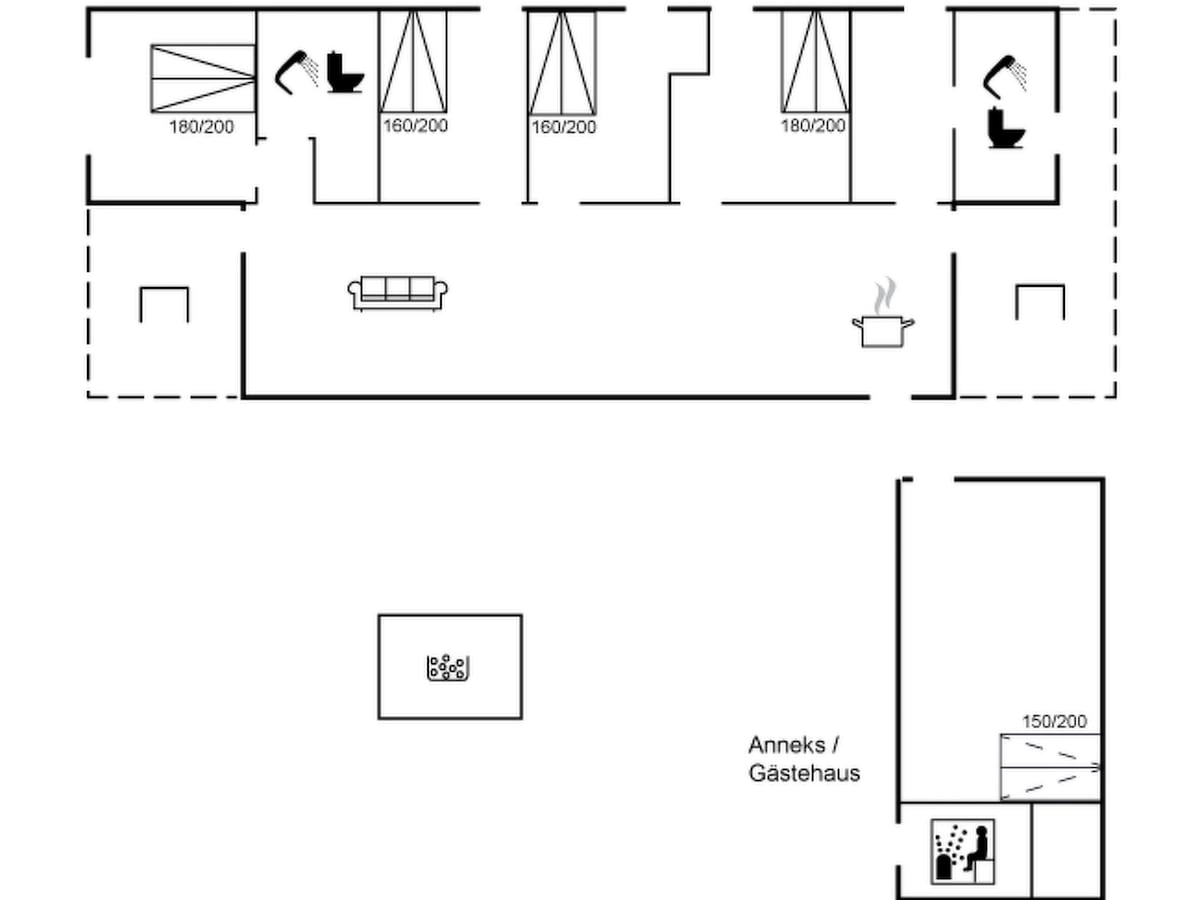 Encantadora, bien cuidada y espaciosa casa de verano de 120 m2 con varias terrazas para tomar el sol. Excelente ubicación en la primera fila de dunas por el camino 38 con 2 minutos a pie de la playa y a solo 900 metros del centro de Blokhus. La casa está al final de un callejón sin salida, muy tranquila y aislada del tráfico. Casa principal, anexo, cobertizo de herramientas y cochera con cargador de 11 kW para coche eléctrico. Casa apta para sillas de ruedas en 1 nivel. Gran área de estacionamiento que pertenece a la casa. Se permiten perros. 2 baños y 4 dormitorios con 10 camas.