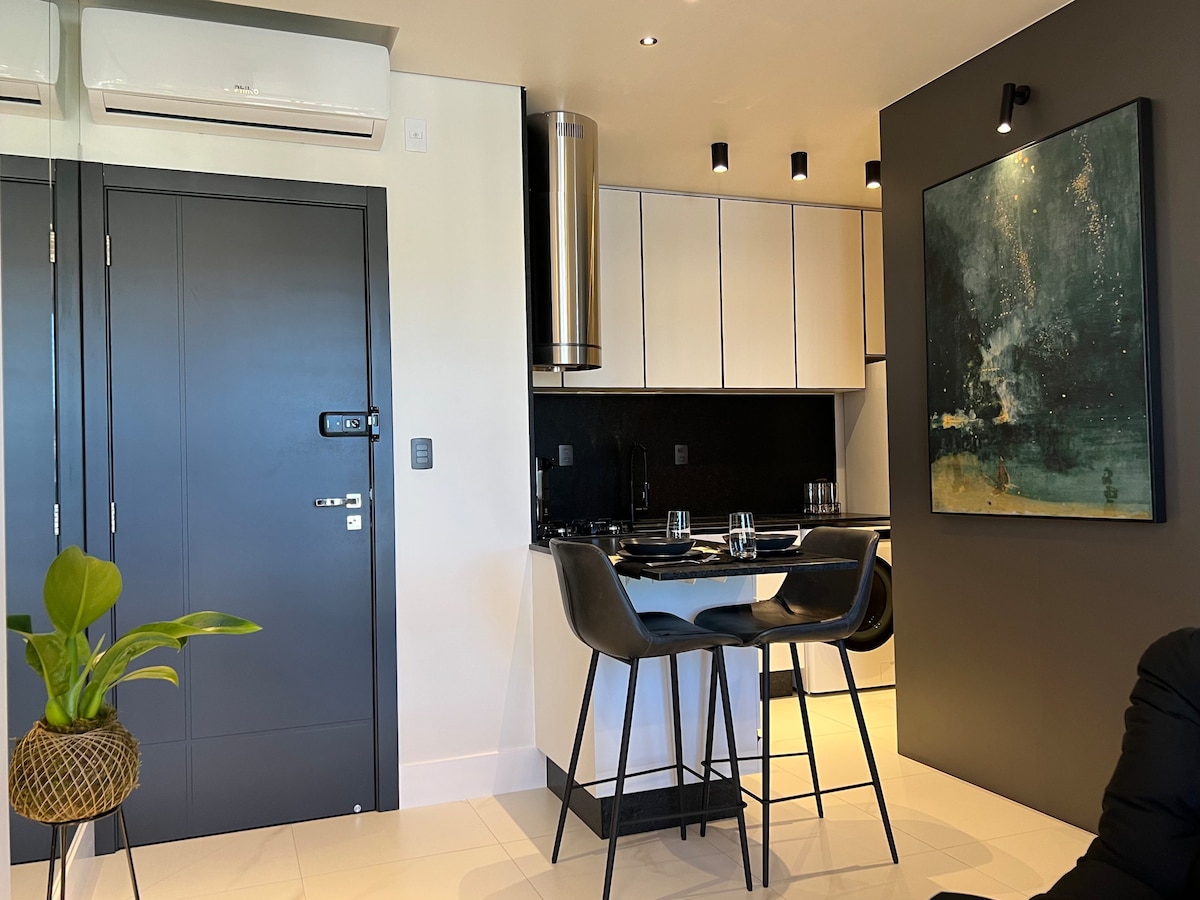 Sofisticado apartamento tipo estudio ubicado a 800 metros del parque Vila Germânica, lugar de eventos como el Oktoberfest. Rodeado de restaurantes, bares y supermercados. Todo para su comodidad: Smart TV 50" Samsung, aire acondicionado split, ducha de gas, wifi fibra 240mb, cocina completa con heladera Brastemp, microondas, horno, estufa, campana extractora, cafetera, purificador de agua, lava y seca, armarios, y por supuesto ¡una cama queen con el mejor colchón!