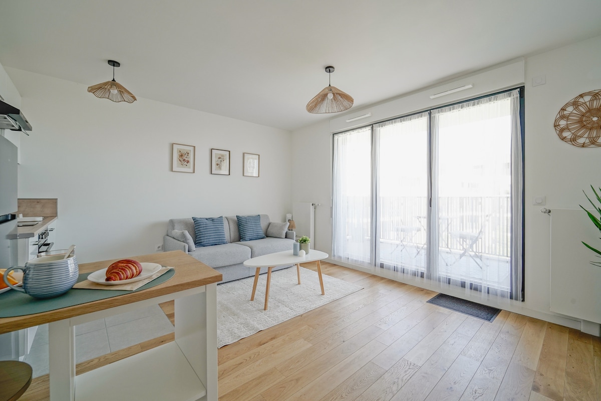 Bienvenido a este moderno y luminoso estudio con balcón amueblado con vistas a un agradable jardín 🌿 Con una ubicación ideal: tranvía T1 al lado del edificio y metro línea 5 a pocos minutos, para llegar a París con facilidad. Acomódate en la sala de estar con sofá cama y disfruta de una cocina totalmente equipada para tus comidas. El baño cuenta con ducha grande y lavadora. Ideal para una estadía de negocios o para el turismo.